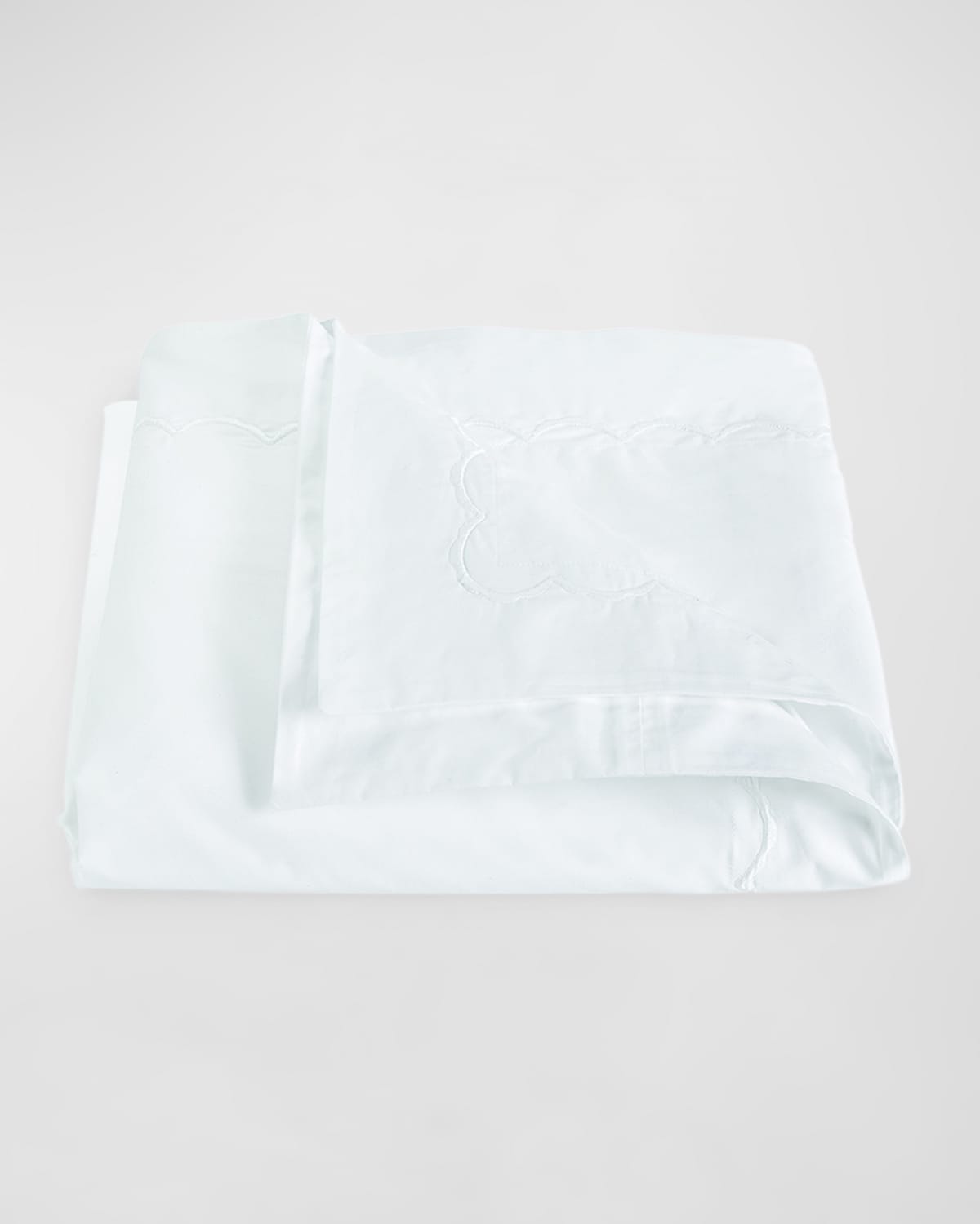 Duvet cover with embroidered scallops. 350threadcount white cotton percale. Duvet covers are made with inside corner ties. Approx. 104"W x 92"L; 3" flange OEKOTEX Standard 100 certified Machine wash. Made in the USA of imported materials.