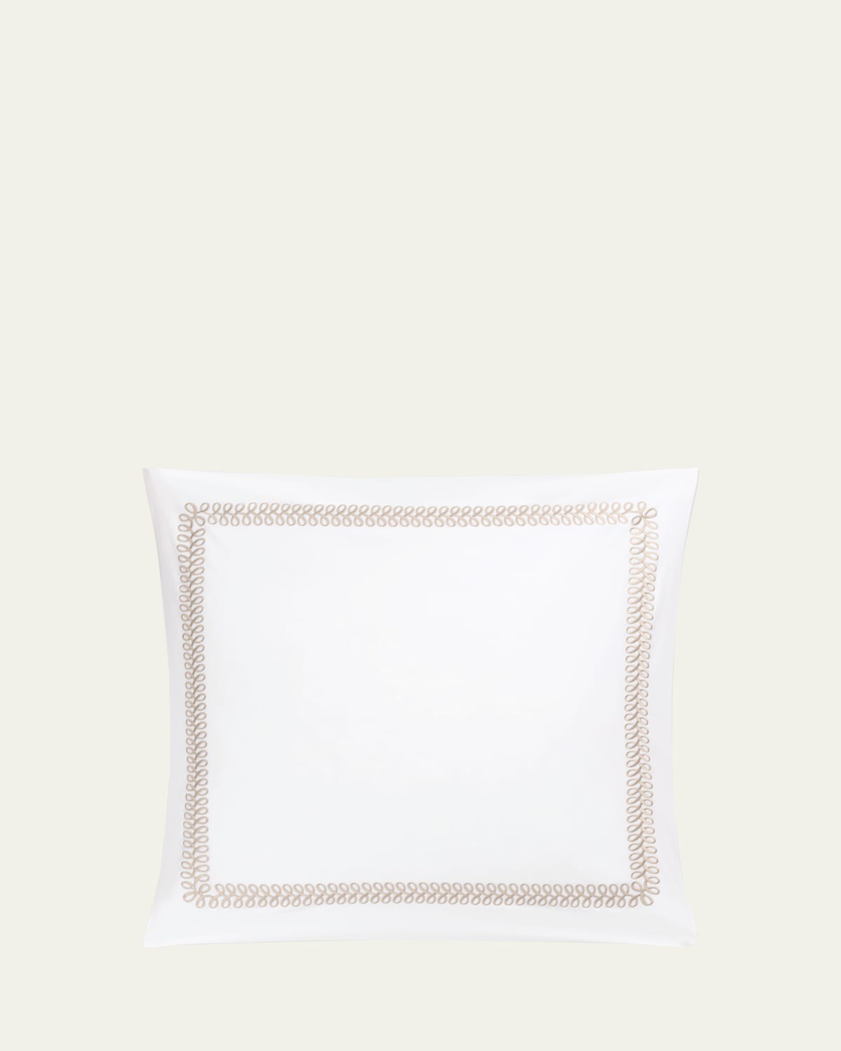 Embroidered on our crisp 520 thread count Ceylon percale, Astor Braid is a style with a quintessential appeal. The bold design from Schumacher's celebrated collection of tapes and trims is a timeless script, suited for pairing with an array of patterns Two heritage companies synonymous with beauty and quality come together in an exciting collaboration. The Matouk Schumacher collection combines Matouk's impeccably crafted linens with Schumacher's extraordinary prints, for beautiful bedding, table, bath, and beach styles that capture the very best of both brands European sham made of cotton percale Approx. 27"L x 27"W Machine wash warm Imported