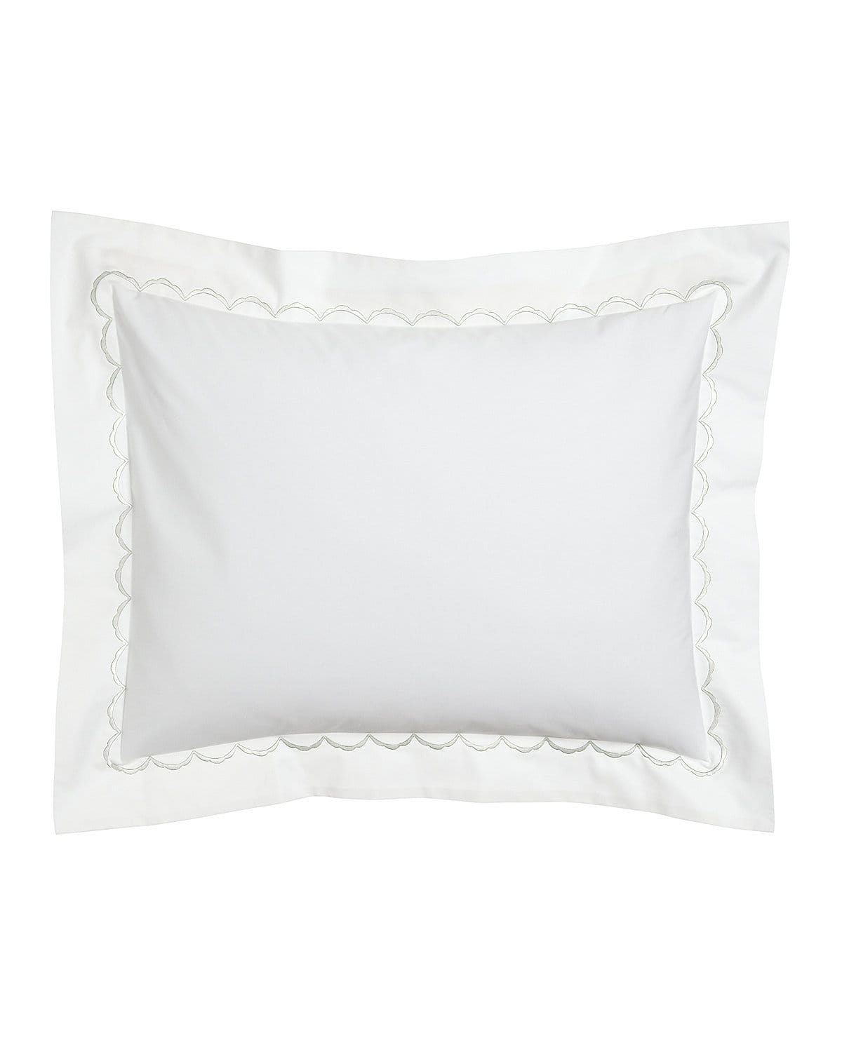 Standard sham with embroidered scallops. 350threadcount white cotton percale. Optional 3initial circlescript monogram. Machine wash. Made in the USA of imported materials.