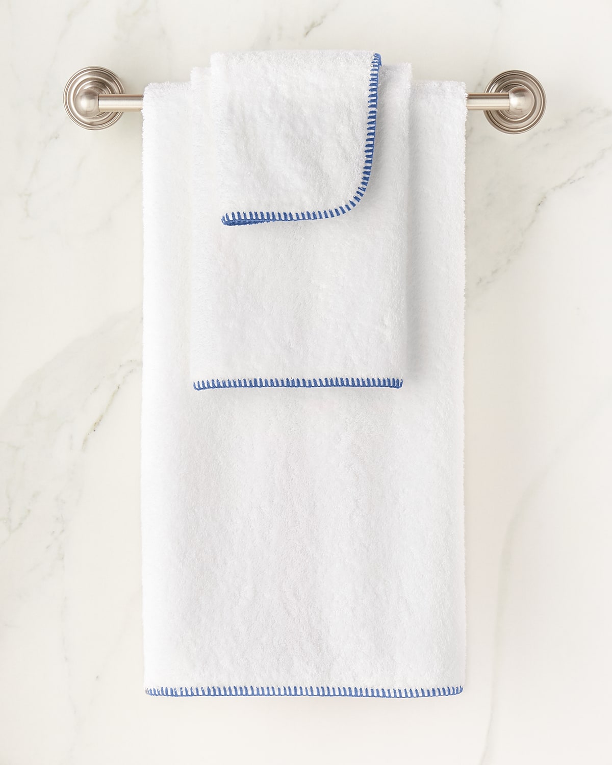 Hand towel with whipstitch edge. Cotton. Machine wash. 20" x 30". Made in the USA of fabric from Portugal.