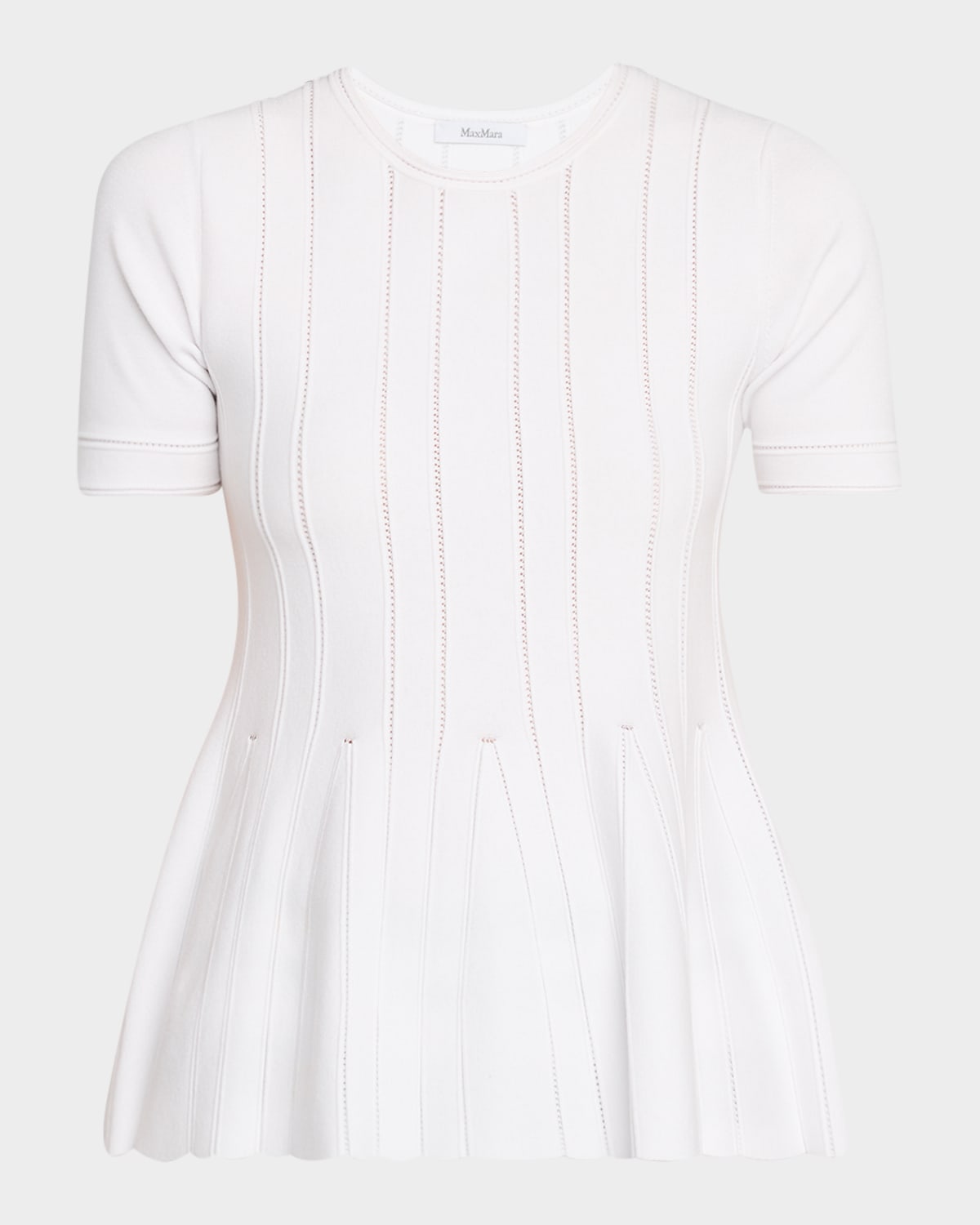 Max Mara "Epoche" peplum top featuring pointelle knit details Crew neckline Short sleeves Fitandflare silhouette Pullover style Viscose/polyester Hand wash Imported