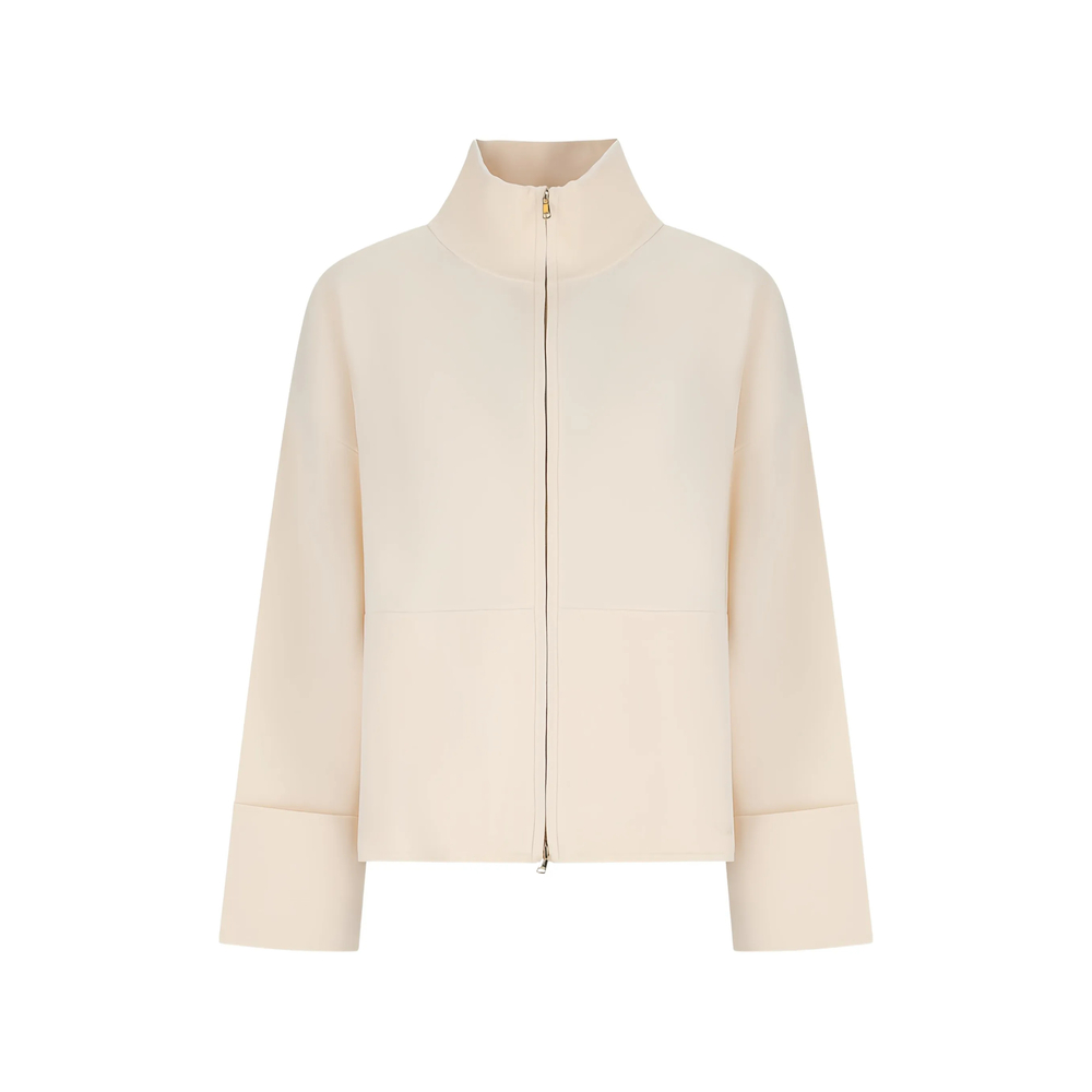 ivory white zip closure high neck long sleeves buttoned cuffs straight hem
