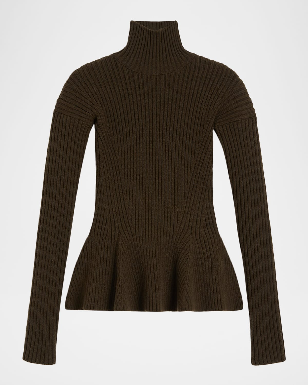 This Max Mara ribbed sweater is crafted in a stretchy and warm woolcashmere blend and finished with a feminine peplum flare Turtleneck Drop shoulders Long sleeves Figurehugging silhouette Pullover style Wool/cashmere/nylon/polyamide Made in Romania