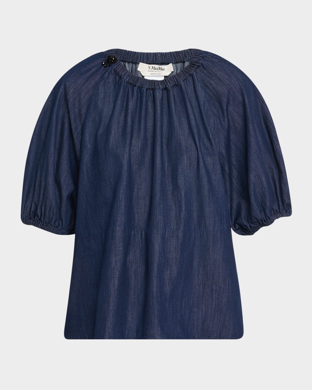 Max Mara "Talia" top featuring a gathered neckline embellished with crystal beading Crew neckline Short puff sleeves Loose fit Pullover style Cotton Machine wash cold Made in Morocco