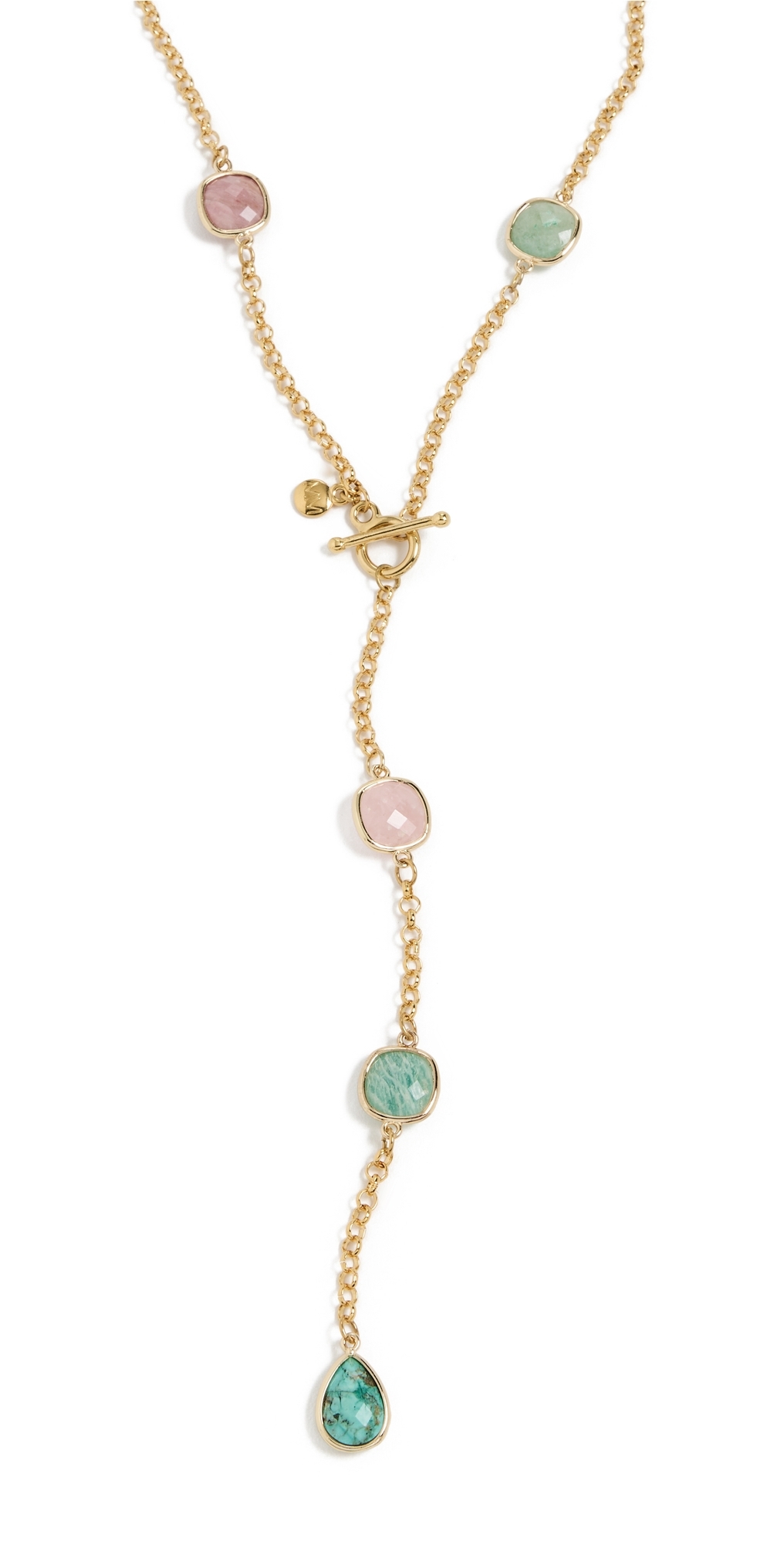 Pear turquoise. Square aventurine. Square rose quartz. Square jade. Gold plate. Lariat. Imported, Romania. Measurements: Length: 21.25in / 54.0cm