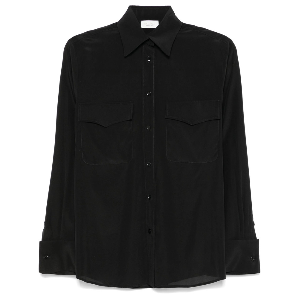black silk blend georgette crepe front button fastening classic collar long sleeves with buttoned cuffs two chest flap pockets rear curved hem