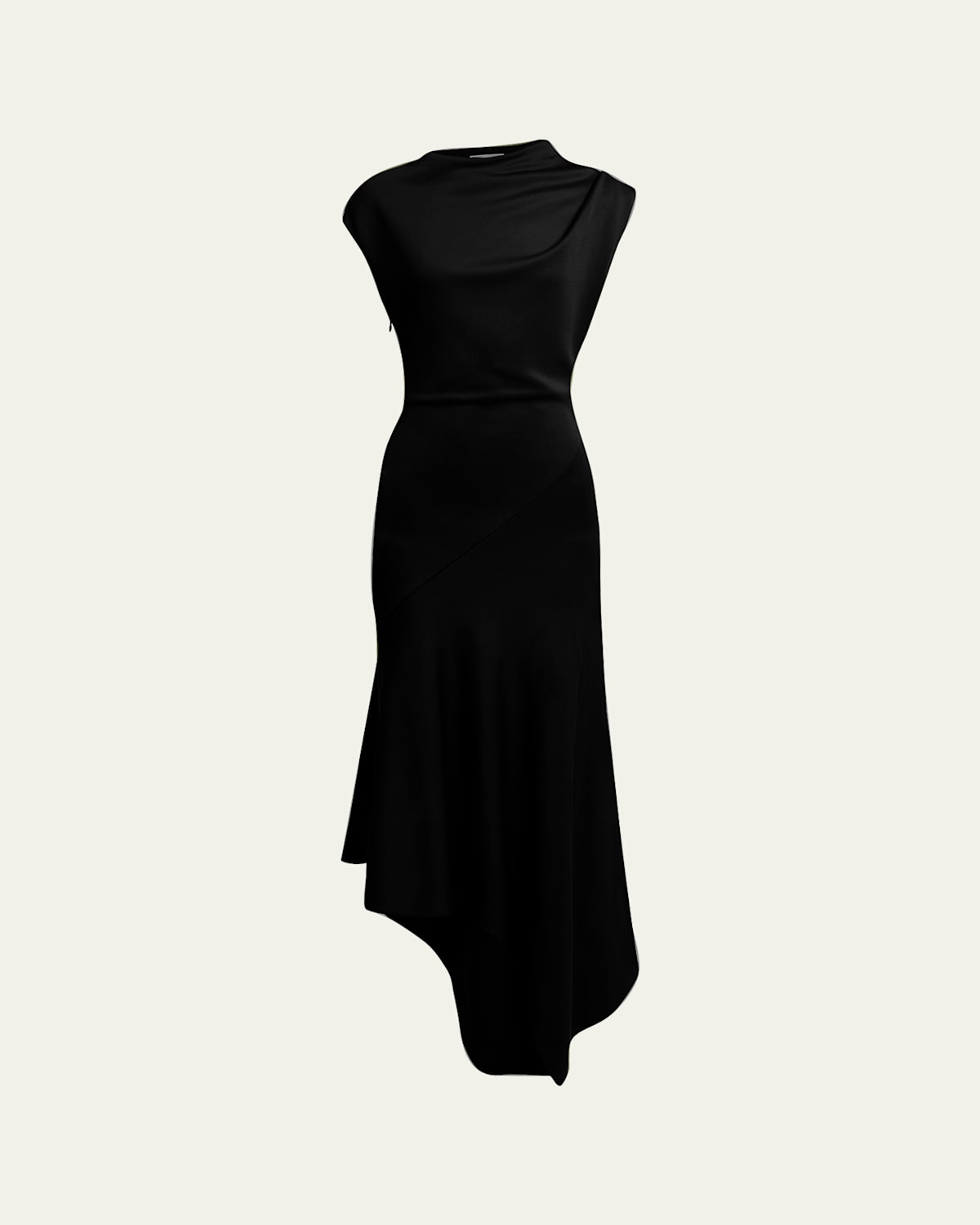 McQueen asymmetric midi dress features a draped style bodice High neckline Short sleeves Hem falls below the knee Aline silhouette Back zip closure Viscose/nylon/polyamide Dry clean Made in Italy