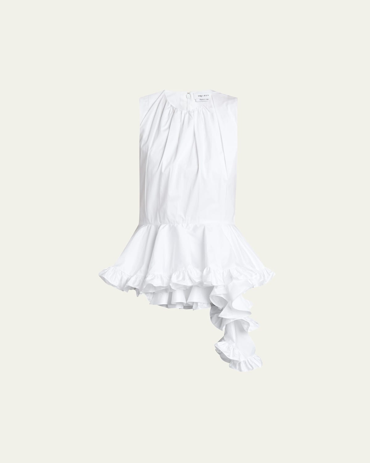 Made from crisp cotton poplin, this blouse by McQueen reimagines the classic sleeveless silhouette with avantgarde cascading ruffles Gathered round neckline Sleeveless Hip length Asymmetric ruffled peplum hem Invisible back zipper Cotton Made in Italy