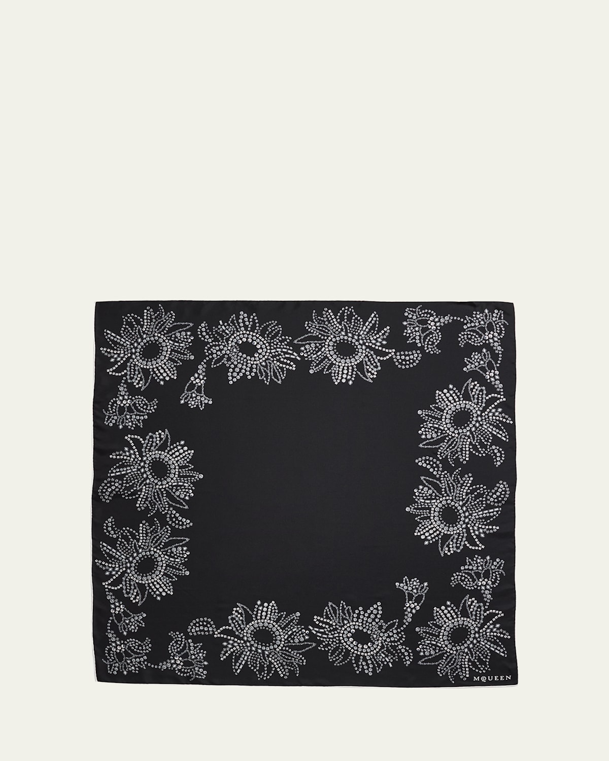 This beautiful McQueen scarf is detailed with an "exploded sunflower" motif around the border in crystals. Can be styled in multiple ways Approx. 36"Sq. Silk Dry clean Made in Italy