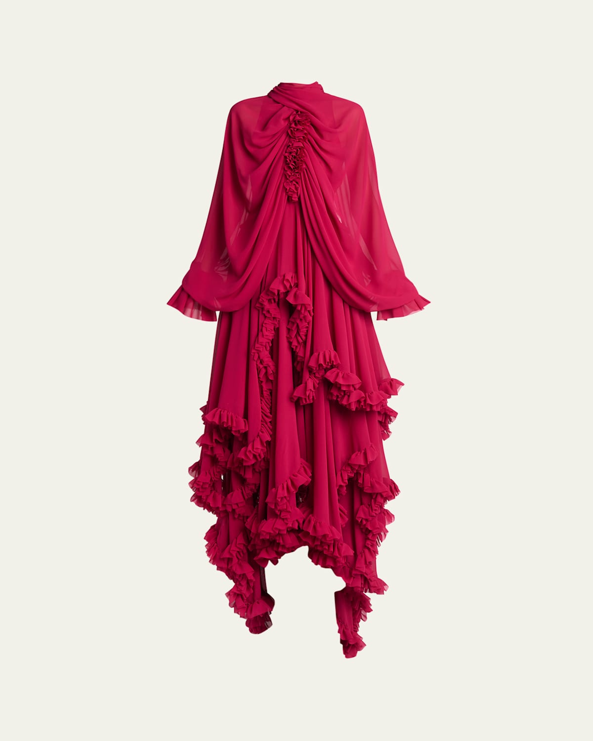 This layered gown from McQueen flutters with ruffle trim, elegantly draped with a semisheer cape that ties behind the neck High neckline Long cape sleeves Open back Full length Trapeze silhouette Invisible zipper Silk/nylon/polyamide Made in Italy