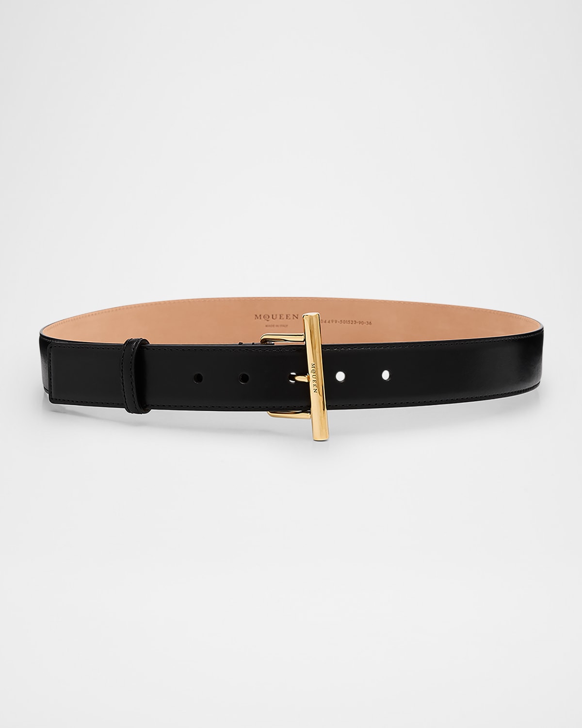 McQueen smooth calfskin leather sling belt finished with signature CrossBar buckle in goldtone metal, engraved with the McQueen logo Adjustable fit Goldtone hardware Medium width Leather Made in Italy