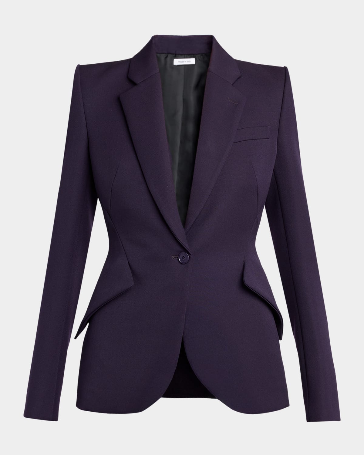 Composed of grain de poudre wool, this McQueen blazer showcases the brand's mastery of tailoring with its contoured seams and hourglass shape Notched lapels; singlebutton front Structured shoulders Long sleeves; button cuffs Single chest welt pocket Angled hip flap pockets Sculpted waist Doublevented back Midlength Wool Made in Italy