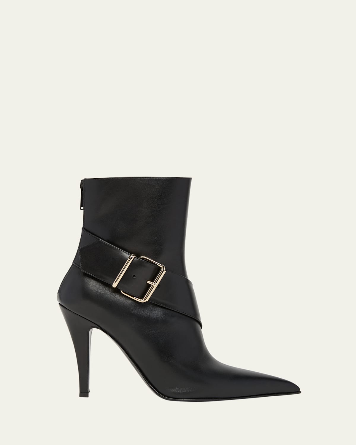 A tonal belt strap wraps around the ankle of these smooth calf leather booties by McQueen, adding an edgy element to a classic silhouette 4.00 in / 100 mm covered stiletto heel Pointed toe Adjustable buckle strap Back zipper Lining: Unlined Made in Italy