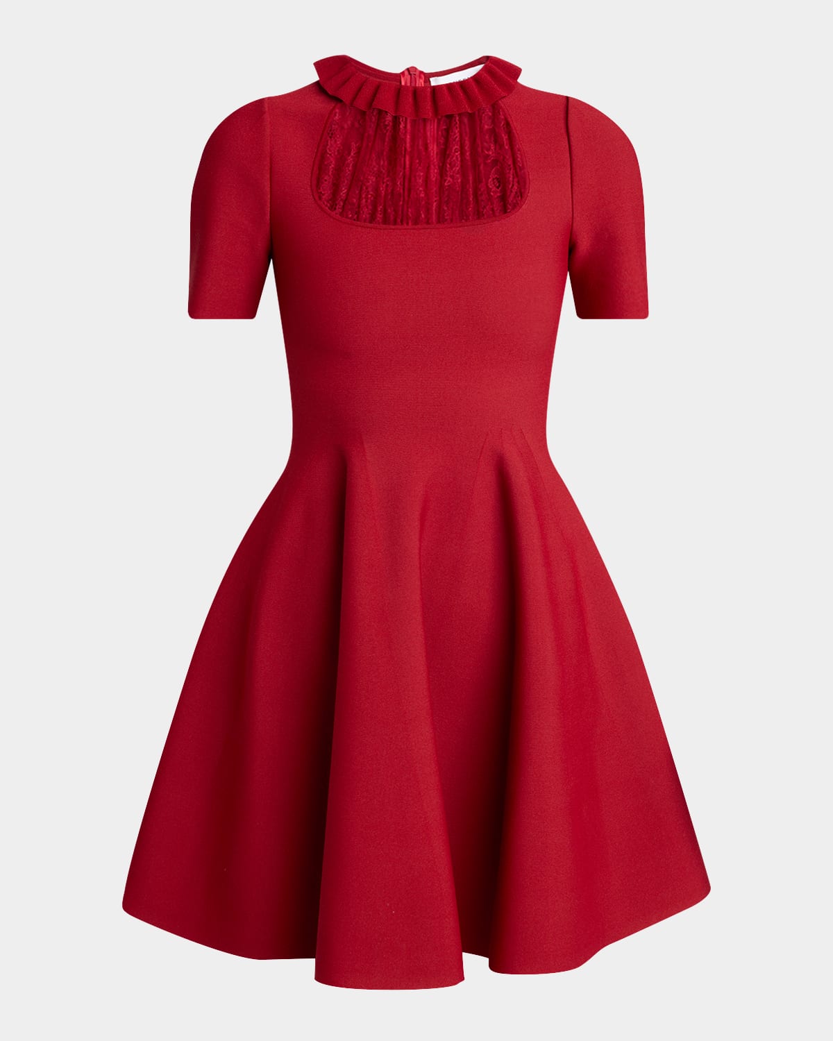 McQueen dress is crafted of viscose crepe featuring a sheer gathered lace chest inset and a ruffle collar detail Round neckline Short sleeves Fitandflare silhouette Mini length Invisible back zip Viscose/nylon/polyamide/polyester Dry clean Made in Italy