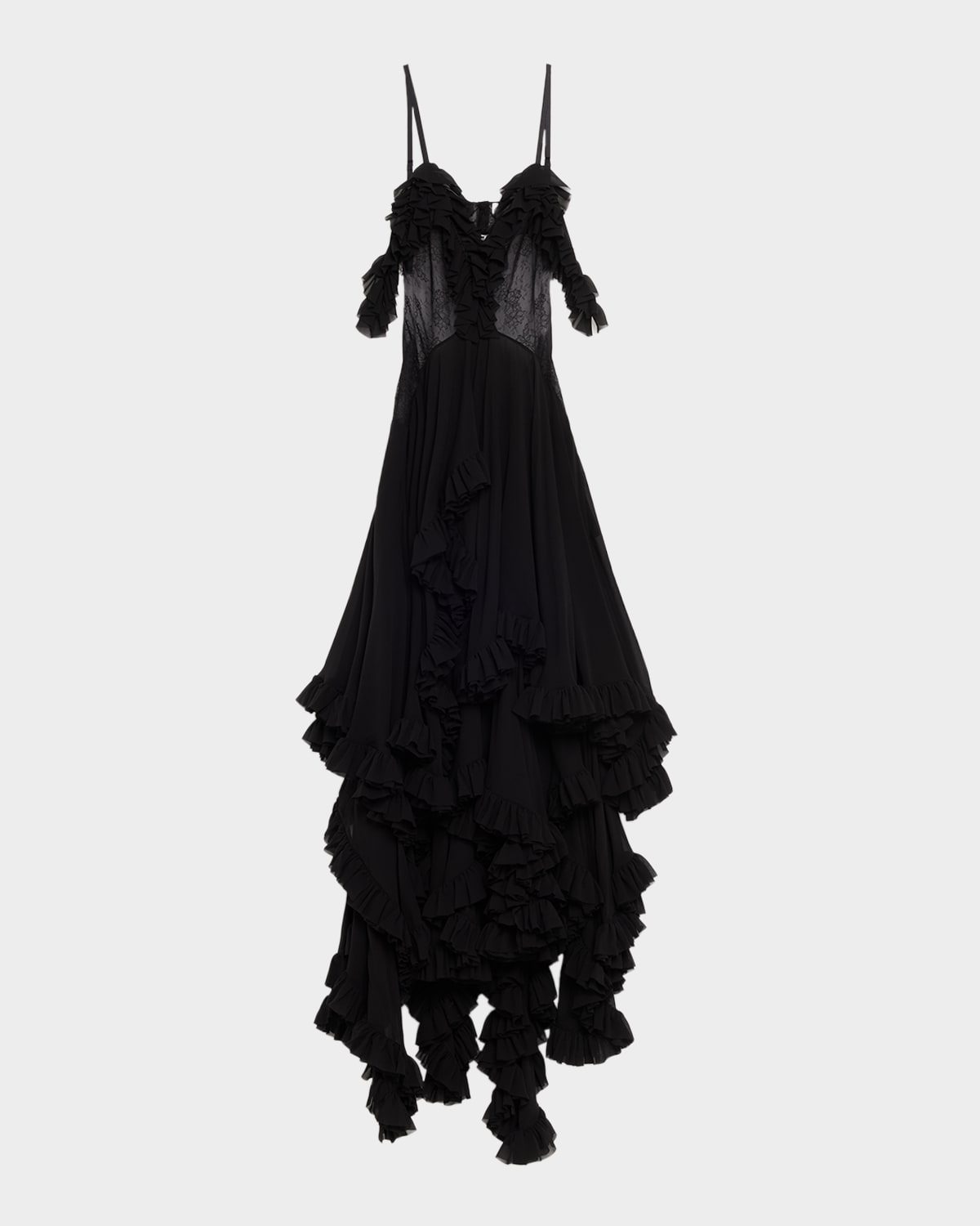 McQueen evening dress is crafted of tiered silk chiffon with ruffled edges, a sheer lace bodice, and an open back V neckline Sleeveless; adjustable spaghetti straps Hookandeye mid back strap Fitandflare silhouette Floor sweeping hem Handkerchief hem Invisible side zip Silk/nylon/polyamide/viscose Dry clean Made in Italy