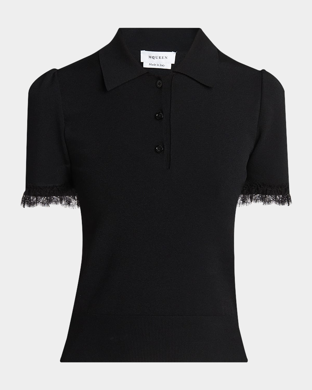 McQueen polo shirt is crafted of a cotton rib featuring a delicate lace ruffle trim along the sleeve cuffs Point collar; threebutton front Short sleeves Slim fit Hip length Pullover style Cotton Dry clean Made in Italy