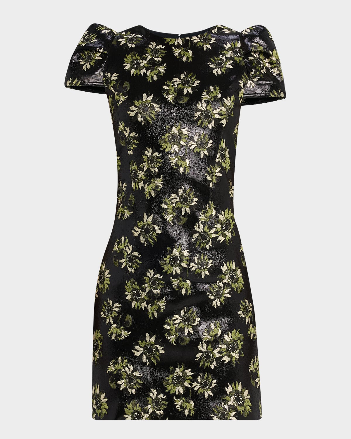 Lacquered Sunflower Jacquard Puff-Sleeve Mini Dress