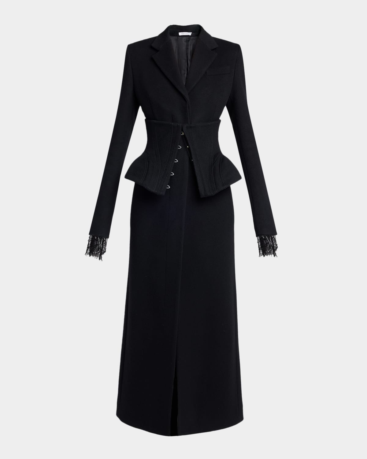 McQueen fuses tailoring with sculptural drama to create this woolcashmere coat featuring a corsetinspired waist panel Notched lapels; concealed hook fastenings Long sleeves; lacetrimmed button cuffs Cinched waist accentuates an hourglass shape Full length Fluid Aline skirt Wool/cashmere Made in Italy