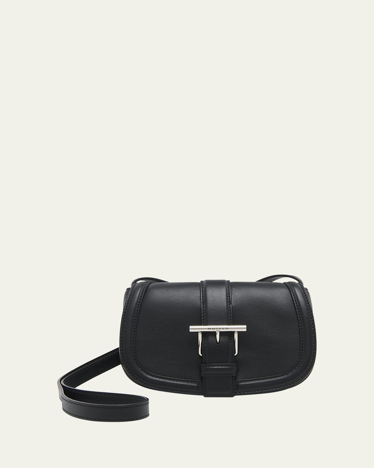McQueen saddle crossbody bag in leather Adjustable crossbody strap Flap top with T bar buckle magnetic closure Interior, one slip pocket Approx. 5.1"H x 7.4"W x 1.9"D Made in Italy
