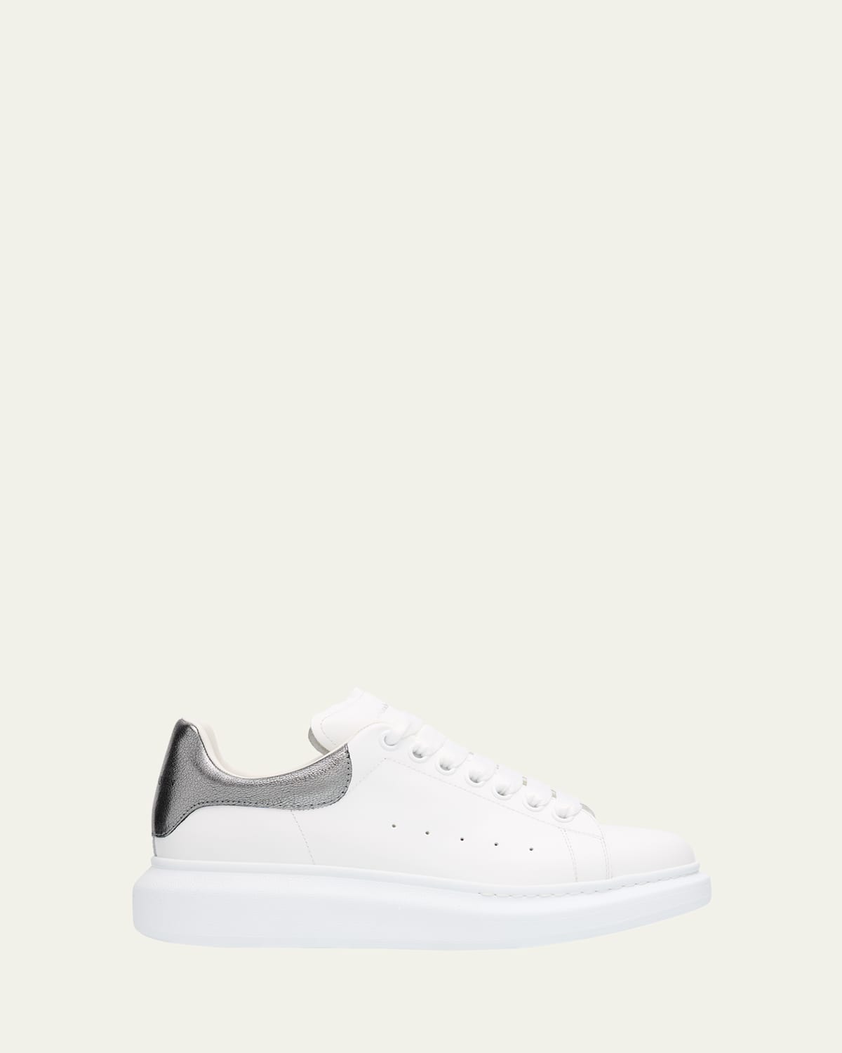 McQueen leather sneaker with colorblock heel counter. McQueen signature on tongue and heel counter Available in multiple colors. 1.5" platform heel. Round toe. Perforated sides. Large flat laces Laceup front. Rubber sole. Runs small, order one size up. Made in Italy.