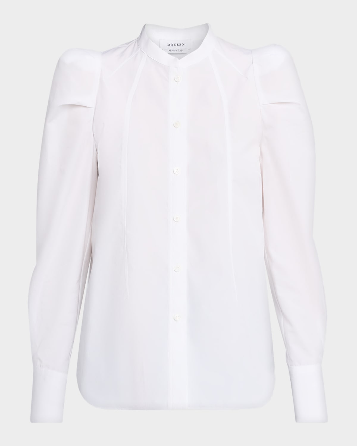 McQueen shirt is crafted of crisp cotton poplin structured with puff shoulders Band collar; button front Long sleeves; button barrel cuffs Relaxed fit Shirttail hem Cotton Dry clean Made in Italy
