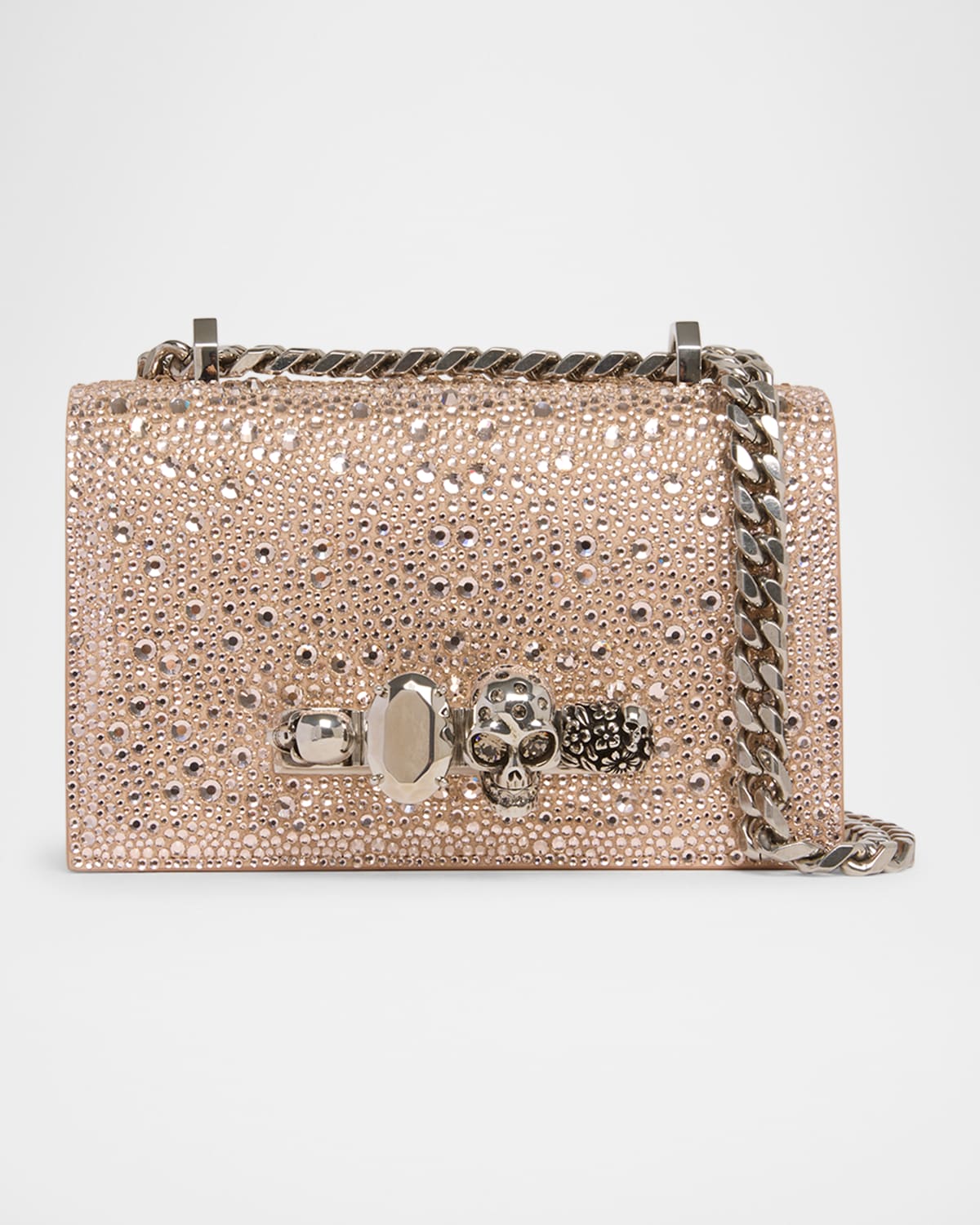 McQueen crystalembellished calf leather shoulder bag with signature skull fourring knuckle duster Sliding chain/leather shoulder strap can be doubled Can be worn as a clutch or shoulder bag Flap top with magnetic closure Interior, one card slot Approx. 3.7"H x 6.8"W x 1.6"D Made in Italy