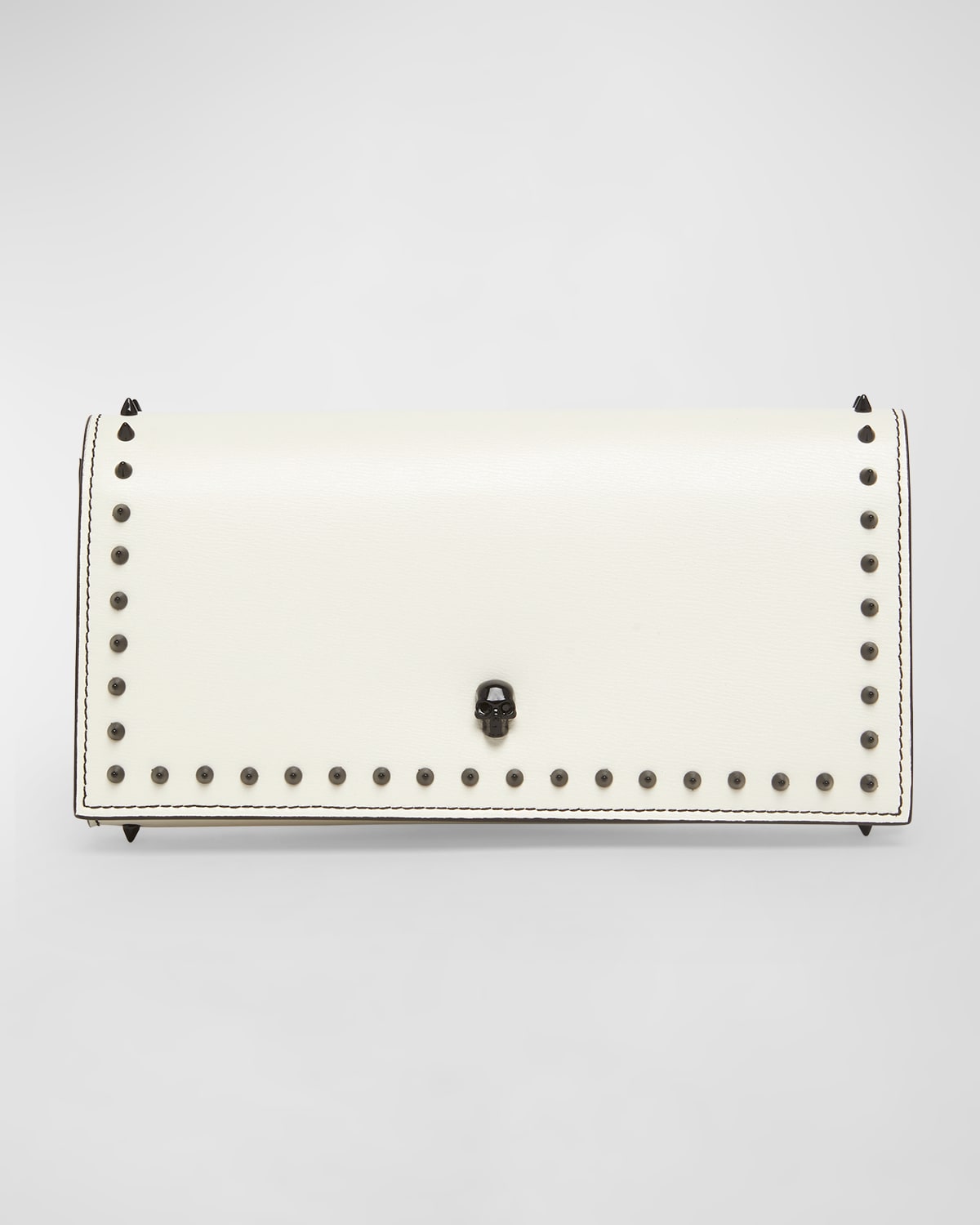 Alexander McQueen leather wallet with spike trim Detachable chain crossbody strap Can be worn as a wallet or crossbody bag Exterior, signature skull hardware Center zip compartment divides interior; card slots Approx. 4.3"H x 8.3"W Made in Italy