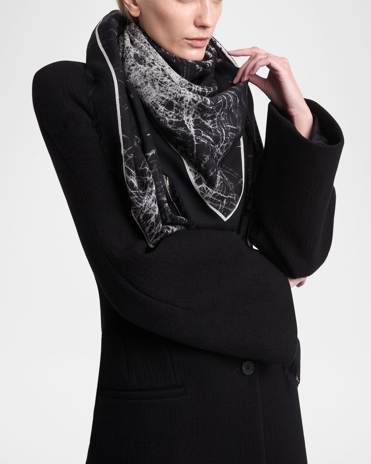 McQueen shawl in smashed glass printed silk Approx. 54.3"L x 53.5"W Eyelash fringe trim Dry clean Made in Italy