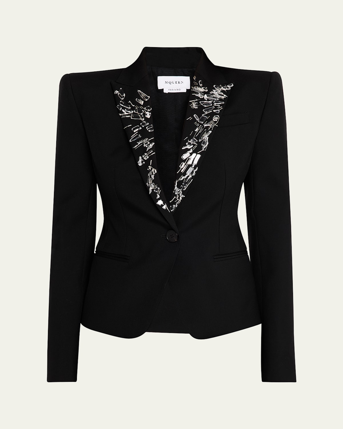 McQueen "Smashed Screen" blazer jacket embellished with handembroidered jagged crystals on the lapels Peak lapels; singlebreasted front Long sleeves; button cuffs Padded shoulders Chest welt pocket; side jetted pockets Slim fit Wool Dry clean Made in Italy
