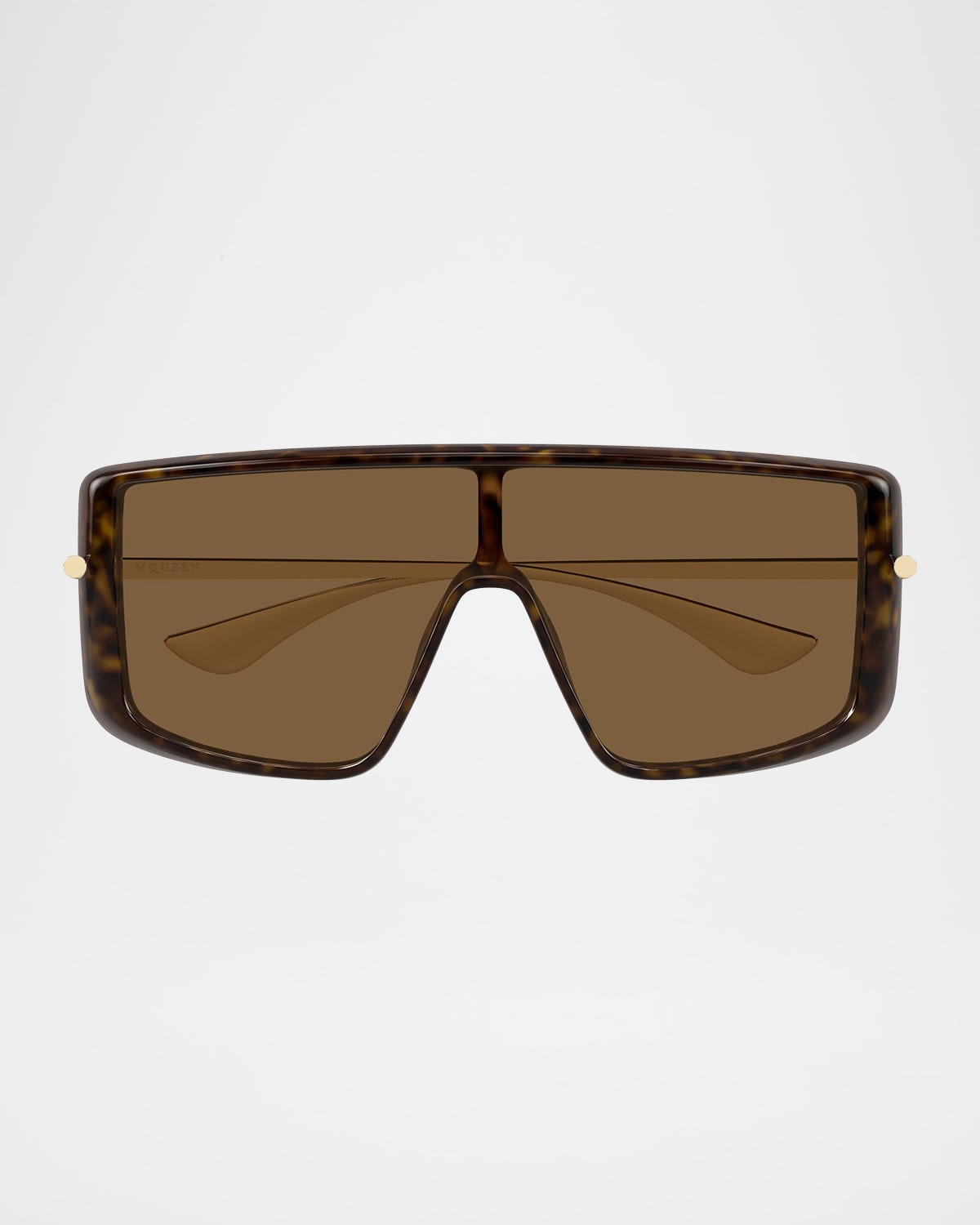 Fitted with an oversized shape, the "AM0524S" acetate sunglasses by McQueen feature TBar detailing interpreted as a temple finished with the laserengraved logo. Lens/bridge/temple (in mm): 991135 Shield frames Fixed nose pads Thin, tapered metal arms 100% UVA/UVB protection Made in Italy
