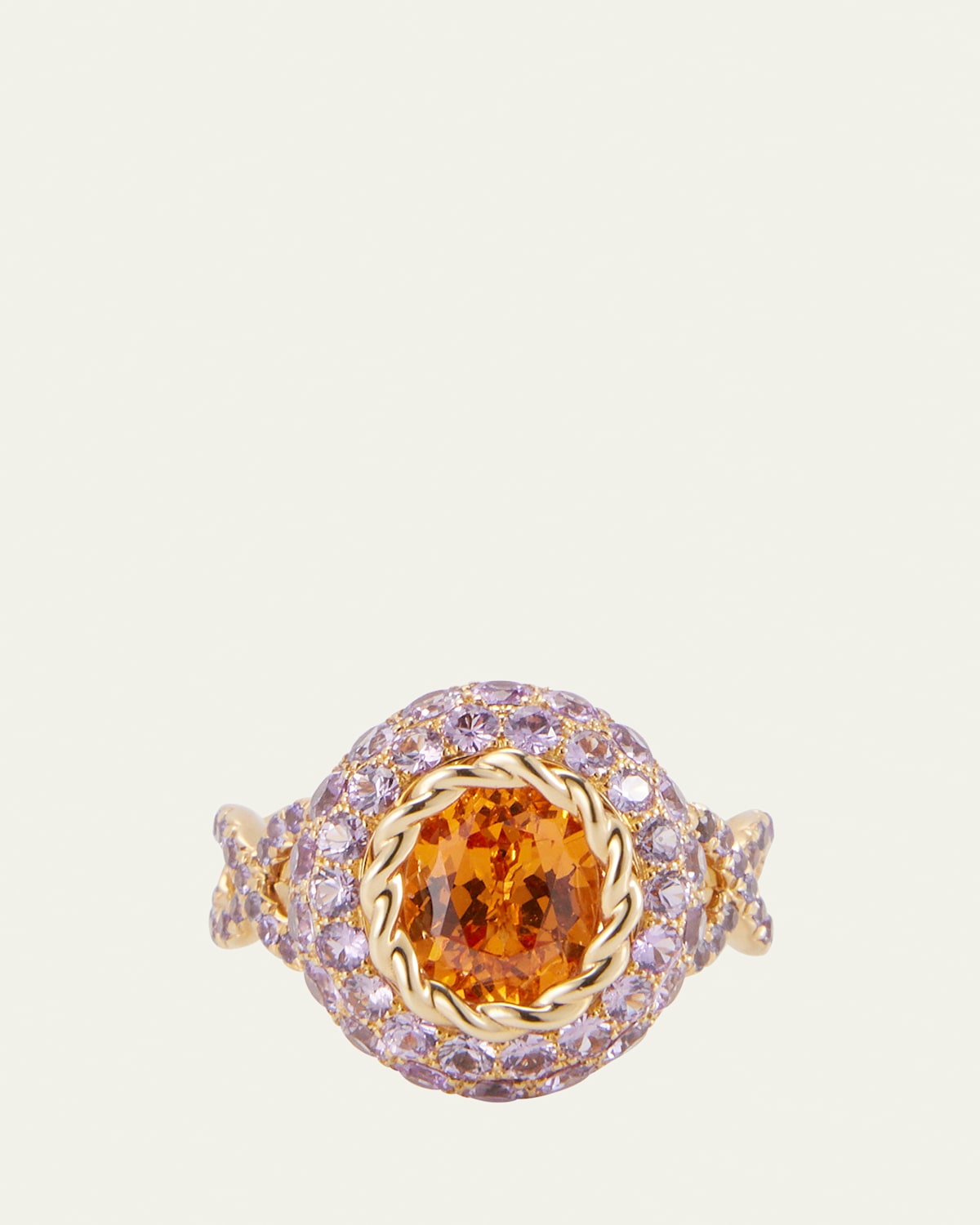 Mellerio cocktail ring Approx. 0.68" length Polished 18karat yellow gold Spessarite surrounded by purple sapphires Spessarite total carat weight: 1.65 2.5 Sapphire total carat weight: 2.8 Made in France