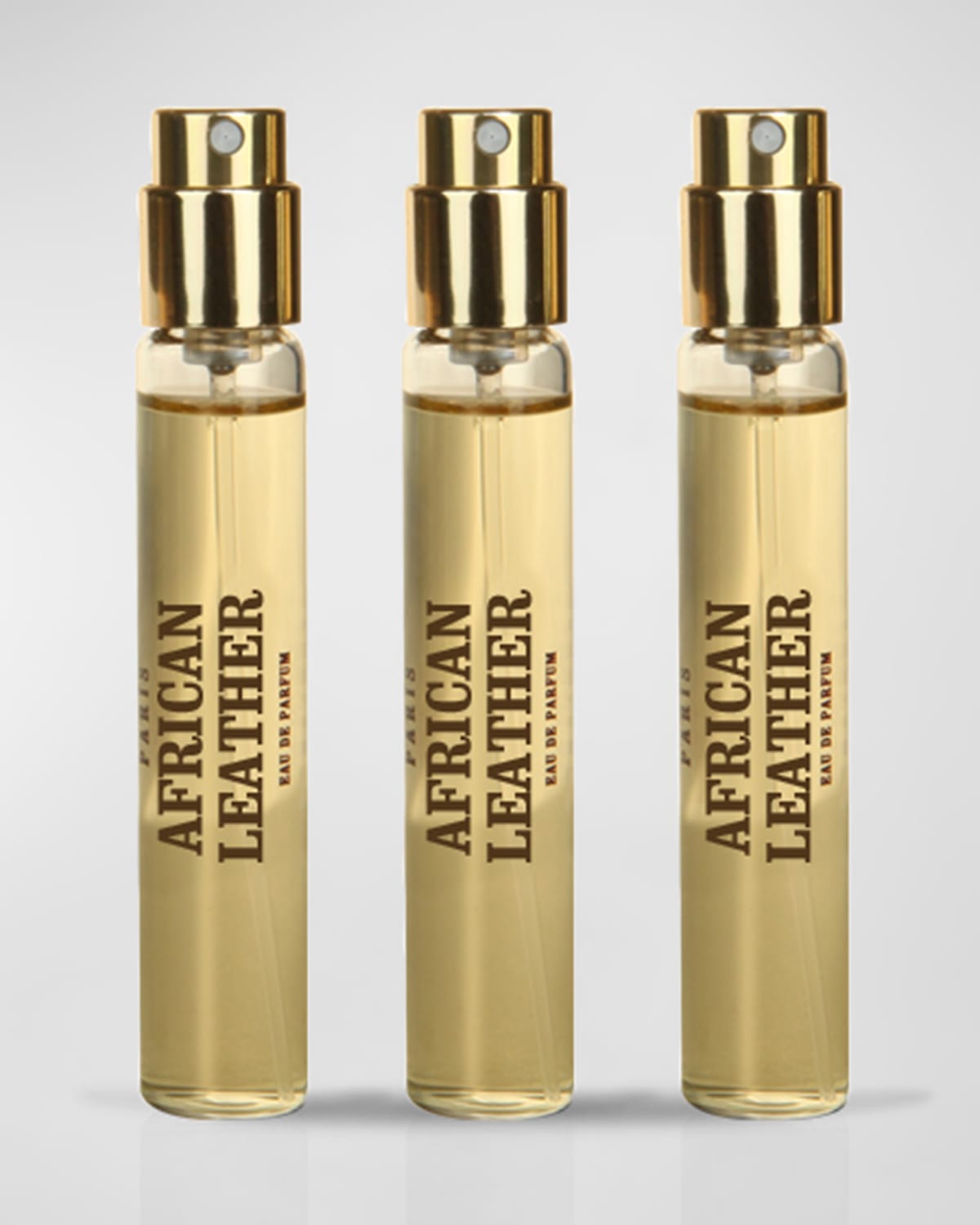 African Leather is part of the 'Cuirs Nomades' collection from Memo Paris. Inspired by the African continent, this leather scent is created from the warm spices of Cardamom and Saffron, with the floral touch of Geranium, blended with Leather accord to create a uniquely wild, safari leather. Elephant trunk, cardamom, giraffe neck, bergamot, wild cat, sand, leopard spots, saffron, rhinoceros horn, cumin, lion mane, patchouli, gazelle hoof, geranium, nocturnal bushbabies, celestial sphere, bateared fox, grapefruit, snake skin, oud accord, eagle eye, vetiver, buffalo neck, musk, green monitor lizards, moss, blue wildebeest, winter sun, zebra stripes, leather accord, cheetah paws, cedar, antelopes racing, savannah, meerkat smiles, spices, crocodile tooth, heat.3 x 0.3 oz./ 10