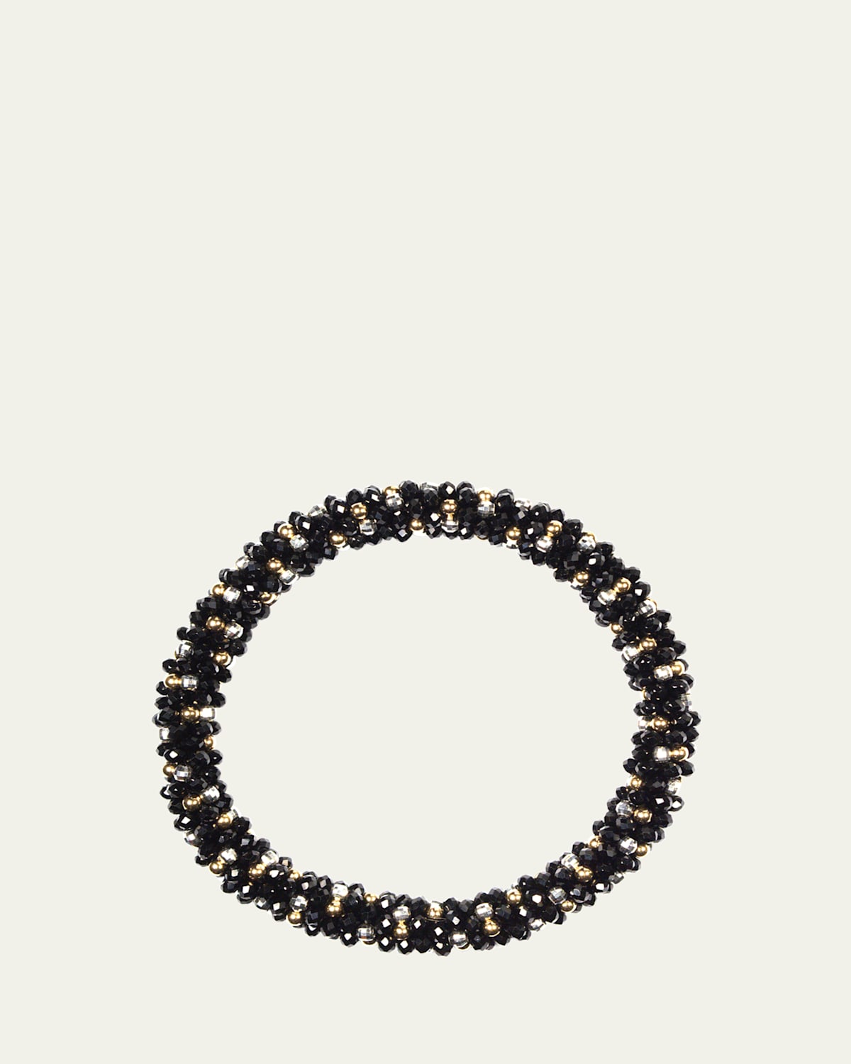 A combination of silver and gold beads shines between faceted black spinel on this Meredith Frederick bracelet. Polished silver and 14karat yellow gold Black spinel Slipon style Made in USA