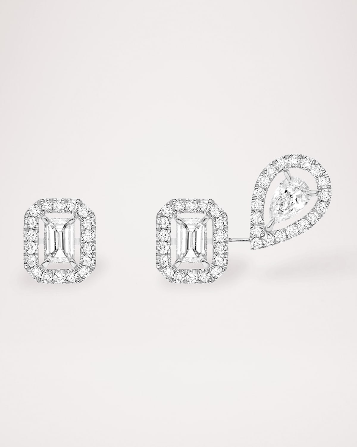My Twin mismatch earrings by Messika. Polished 18karat white gold hardware. Pear and emeraldcut F/VS diamonds. Pear diamond rests along the earlobe. Micropavé diamonds at each station. FG/VS diamonds; 0.42 total carat weight. Postbacks for pierced ears To care for your Messika piece, we recommend that you gently clean it under warm water with a small, softbristled brush and a mild black soap.
