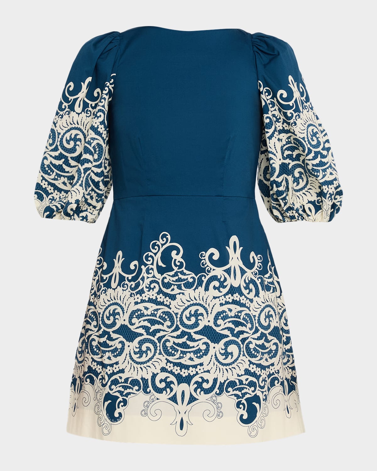 Crafted in crisp cotton poplin, this Mestiza New York "Pippa" mini dress features a lace print and pleated shoulders for a touch of puffy volume 2inch foldover hem allows for easy tailoring Approx. 34"L from shoulders to hem High neckline Elbow blouson sleeves Elasticized cuffs Hem falls above the knee Aline silhouette Invisible back zipper Cotton Lining: Cotton Imported