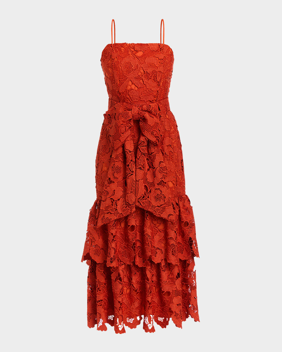 Mestiza New York "Vanessa" midi dress in floral lace with ruffle tiers Approx. 49.5"L from shoulders to hem Square neckline Sleeveless Adjustable straps Waist selftie Hem falls below the knee Aline silhouette Invisible back zipper Polyester/cotton Dry clean Imported
