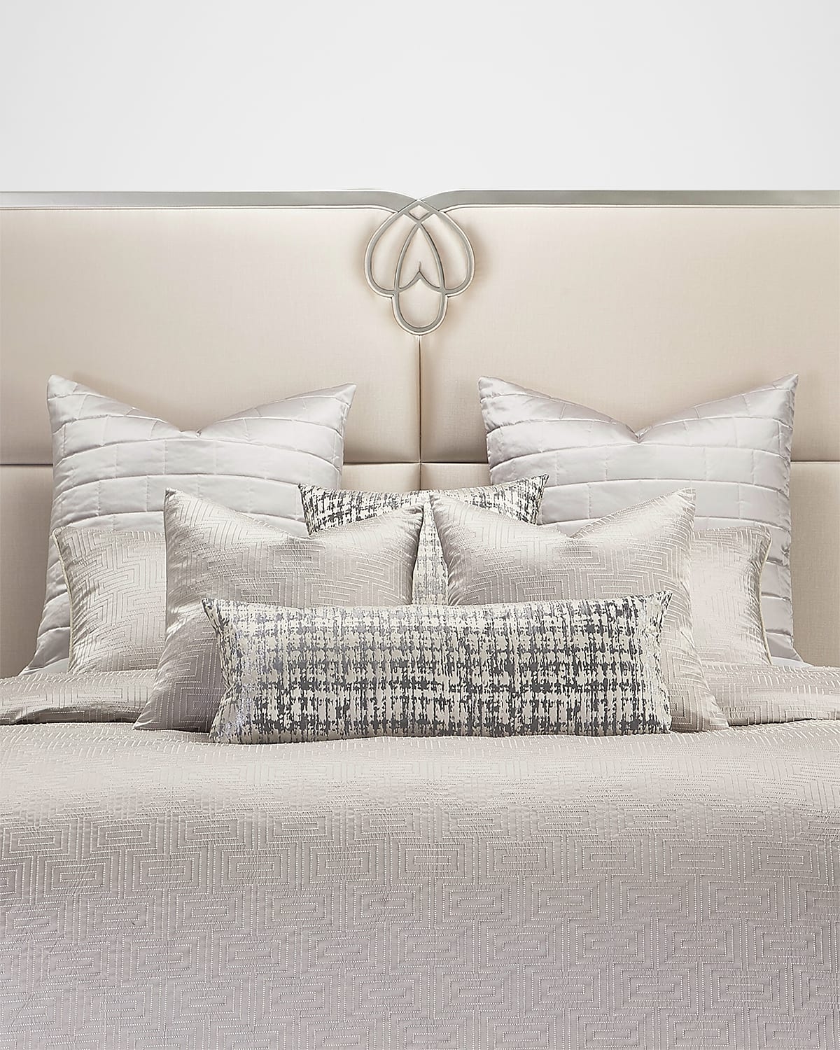 The Casey Comforter Set is all about ultrafine artistry and modern refinement. This stunning ensemble brings a collage of textures and patterns that are grounded by a soft, solid gray color and a captivating sheen. Featuring a spaced rectangle motif in a delicate jacquard pattern, this subdued set radiates elegance and relaxed comfort. Casey showcases colorcoordinated twist cord, shams that coordinate with the main fabric, and euros that are quilted with a subway tile motif. All accessory pieces reverse to coordinating fabric for perfect style flexibility. This set includes one comforter, two standard shams, two euro shams, and four decorative pillows with waterfowl feather fill Pillow sizes include (2) 20"Sq., (1) 22"Sq., and (1) 13" x 24" Hidden zip closures on all pillows Comforter, approx. 92" x 96" Standard shams, 20" x 26" Euro shams, 27"Sq. Item Weight (Lbs.): 27.0 Polyester Dry clean, spot clean 9piece set Imported