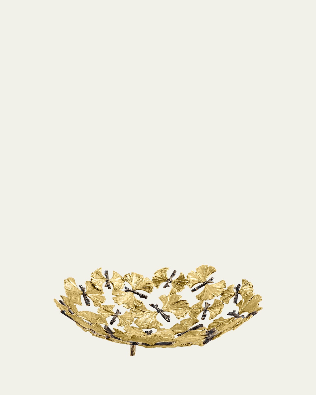The Butterfly Ginkgo Collection celebrates the representation of flora as fauna. Michael's fascination with a particular type of ginkgo tree, the ginkgo Biloba, or "Butterfly ginkgo", which grows with a double leaf reminiscent of a butterfly's wings, gave rise to a fantasia image of the plant Handcrafted of brass Approx. 9.5"L x 9.5"W x 3"T Hand wash Imported