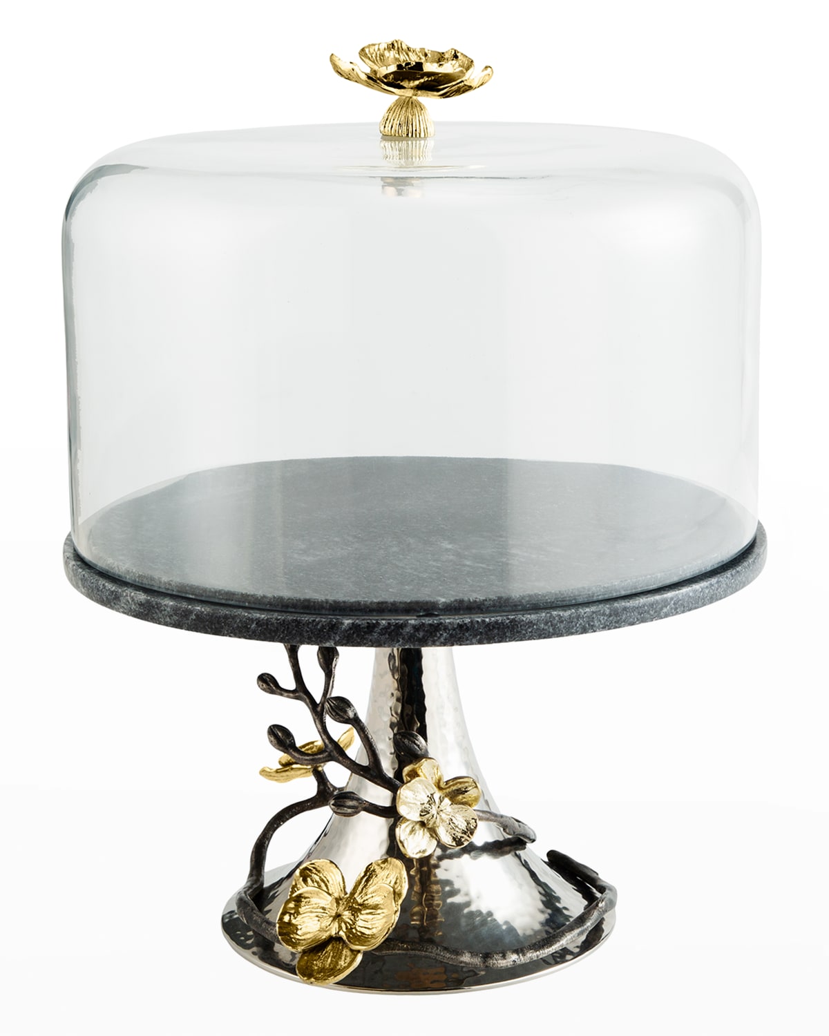 Handcrafted cake stand is made of glass, black marble and nickelplate. Oxidized brass and brass plate detail. Approx. 6.25"T x 11"D. Imported.