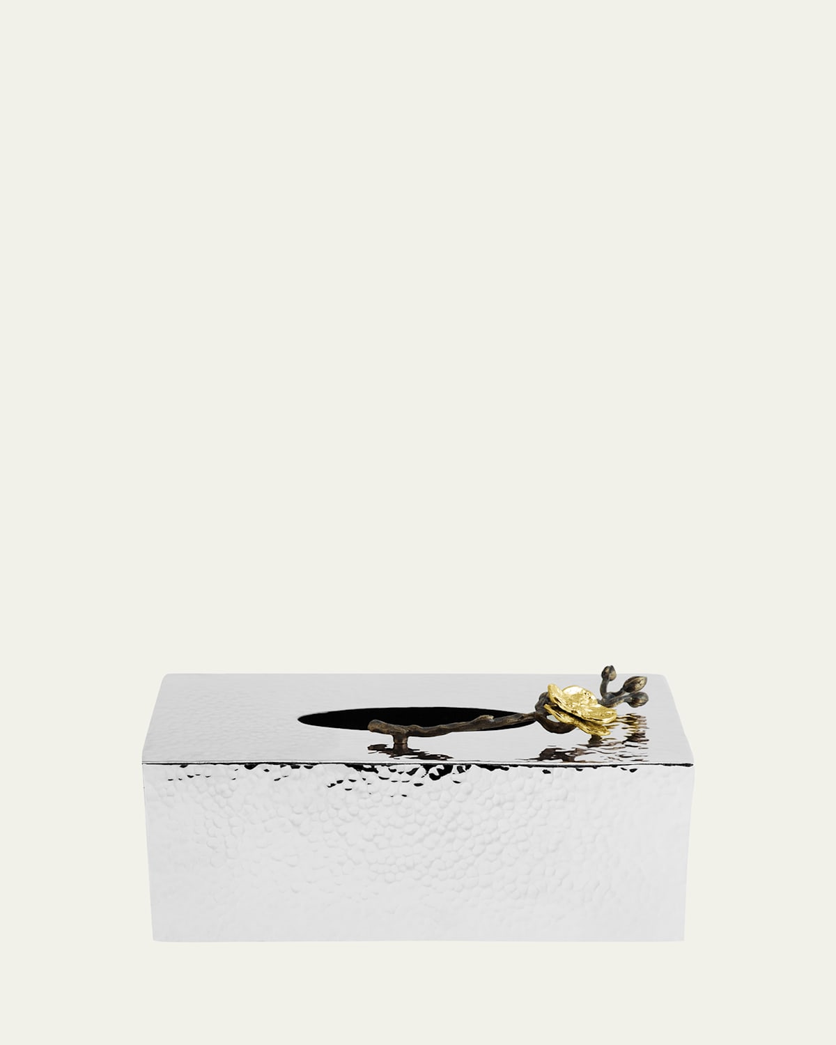 Orchid tissue box holder made of stainless steel, brass, and powder coated metal Approx. 9"L x 5"W Imported