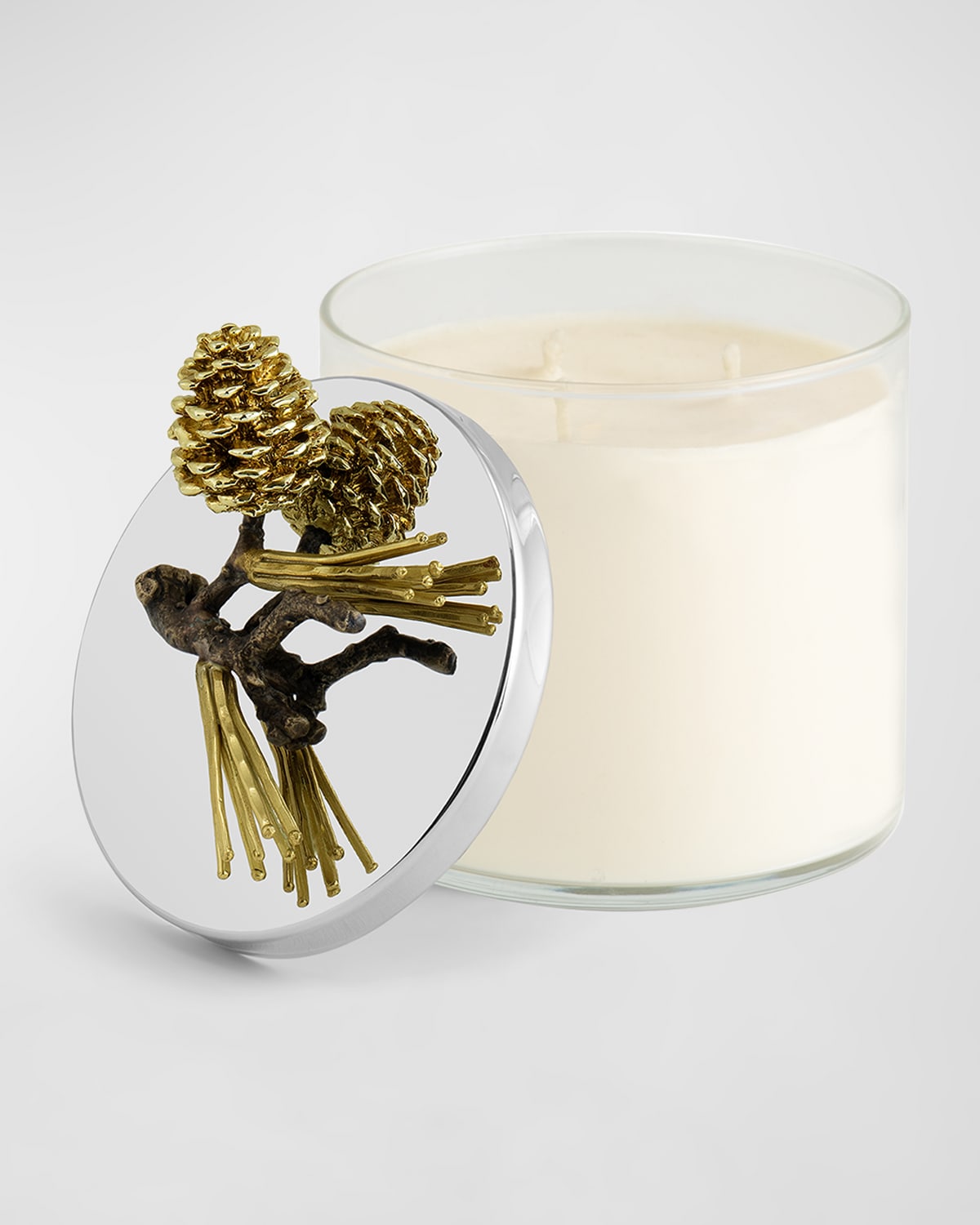 Handcrafted of stainless steel, brass, polyresin, and soy wax Three wicks Fragrance profile: spicy/warm Burn time: 60 hours Net wt: 13.5 oz Item Weight: 0.8 lbs Hand wash Imported