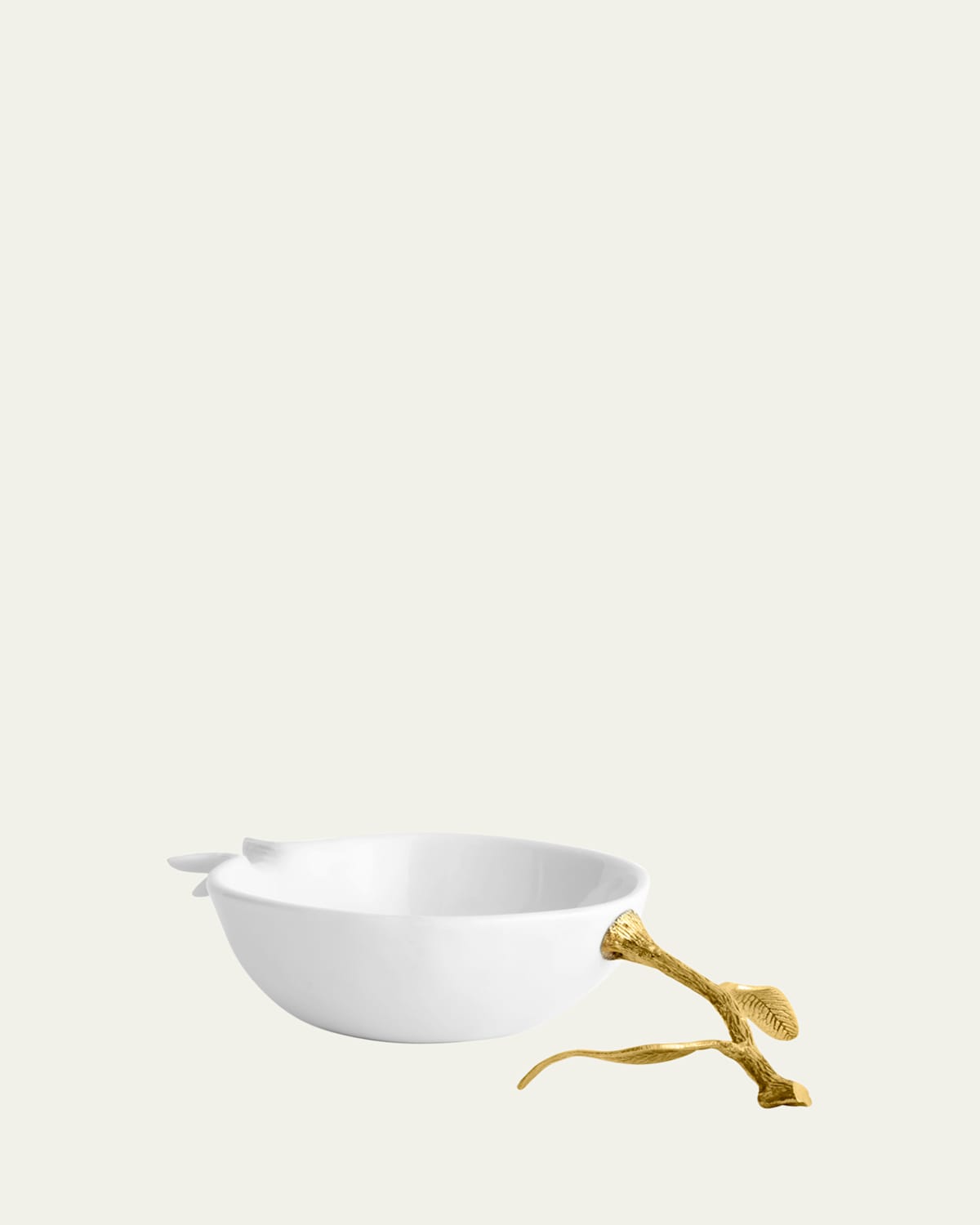 The Michael Aram Pomegranate Collection takes its inspiration from one of the most universal and ancient symbols in the world. The fruit has been prized across the globe, across cultures and across time as a representation of life, rebirth, and renewal as well as fertility and union. Handcrafted bowl made of bone china. Features brassplated metal stem accent. Approx. 7.5"W x 4"D x 1.5"T. Imported.