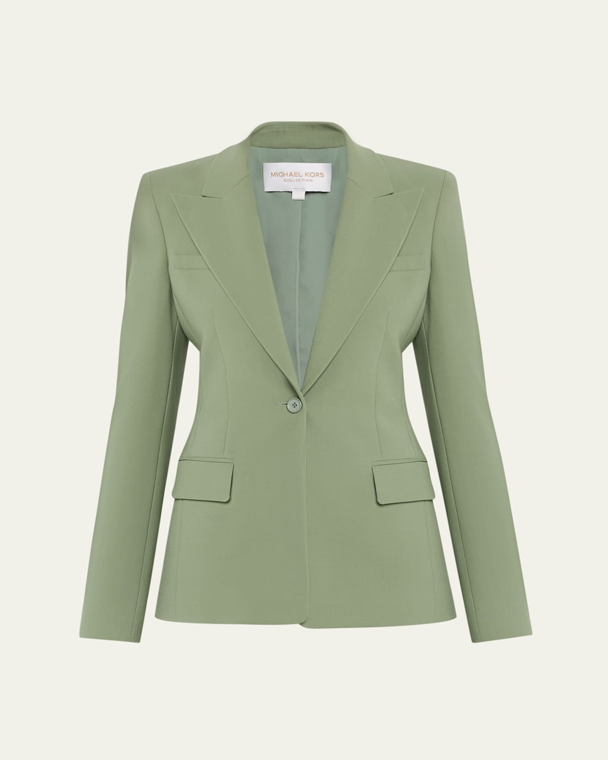 Michael Kors Collection "Georgina" blazer sculpted with elegantly curved seams that contour the silhouette, providing a poised finish to your suiting look Peaked collar; onebutton front can be opened for an effortless, warmwelcome feel Long sleeves; aligned button cuffs Tailored, singlebreasted style Flap pockets Virgin wool/elastane Made in Italy