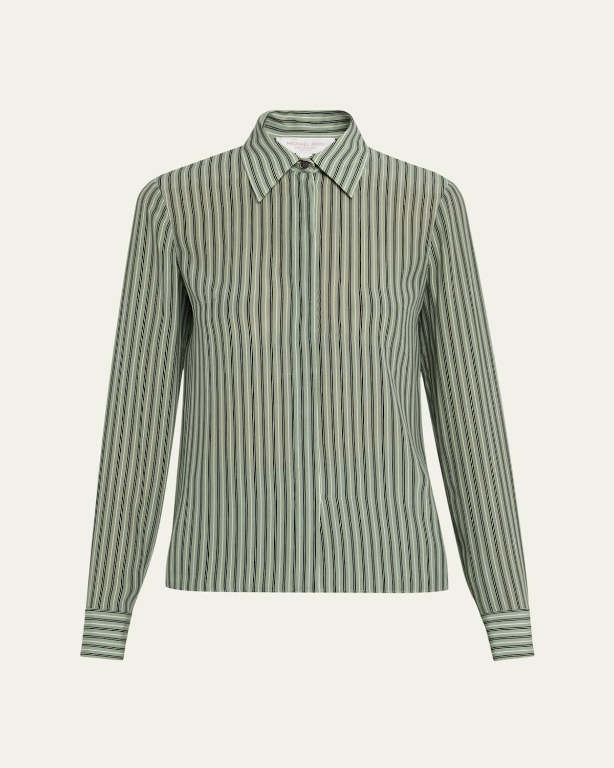 Draped in fluid silk crepe de chine, the "Hansen" striped pajama shirt from the Michael Kors Collection is a soft staple balanced under structured layers Spread collar; button placket front Long sleeves; onebutton cuffs Straight hem Fluit fit Silk Made in Italy
