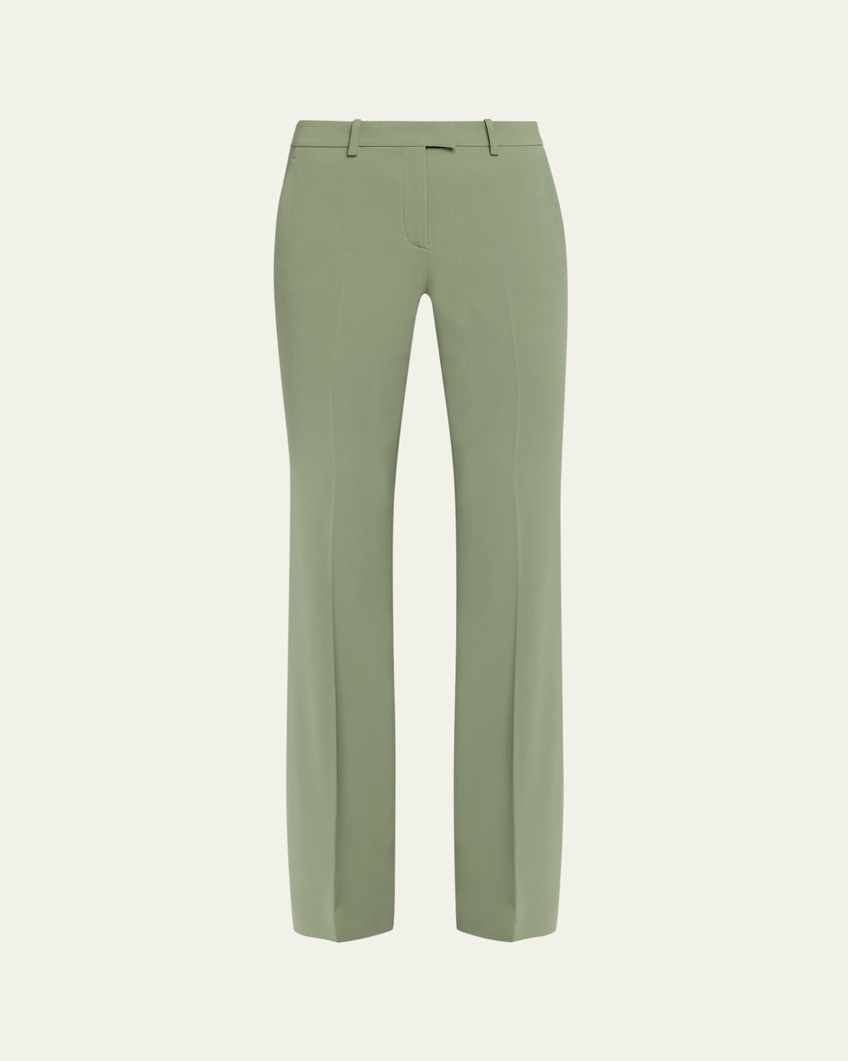 Michael Kors Collection "Haylee" trousers in stretch wool Mid rise sits high on hip Flat front Side slip pockets Back buttonwelt pockets Flared legs Full length Hooktab/zip fly; belt loops Virgin wool/elastane Made in Italy