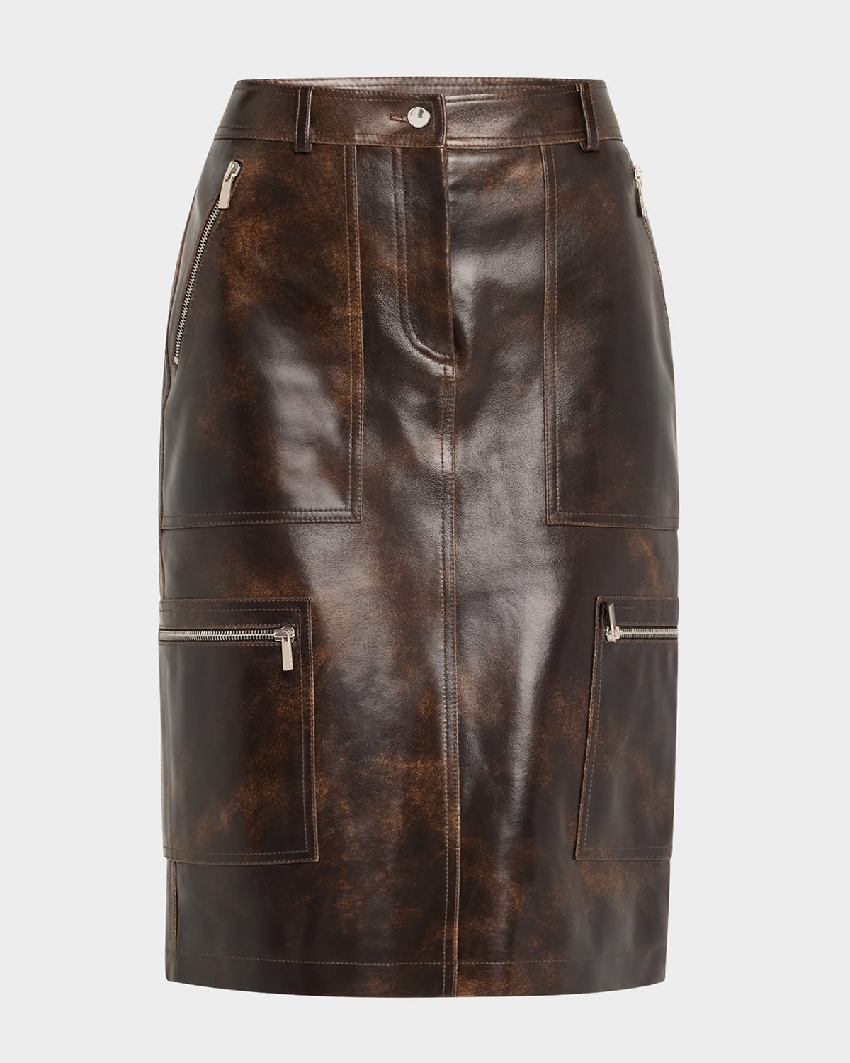 Michael Kors Collection cargo pencil skirt Button/fly; belt loops 6 zipper pockets Zipup slit at the back Hem falls below the knee Pencil style Leather Made in Italy