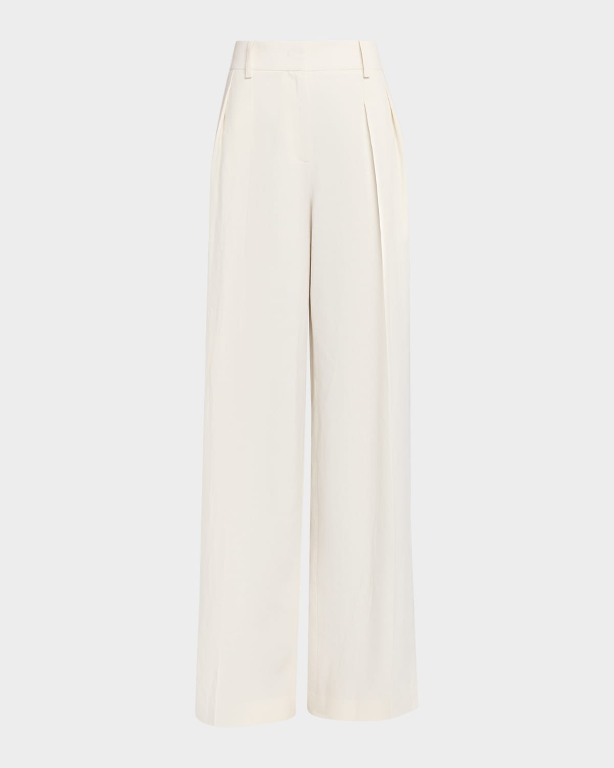 Michael Kors Collection sandwashed pleated linen wideleg slouched trousers High rise Button/zip fly; belt loops Side slip pockets; back welt pockets Full length Relaxed fit Linen Made in Italy
