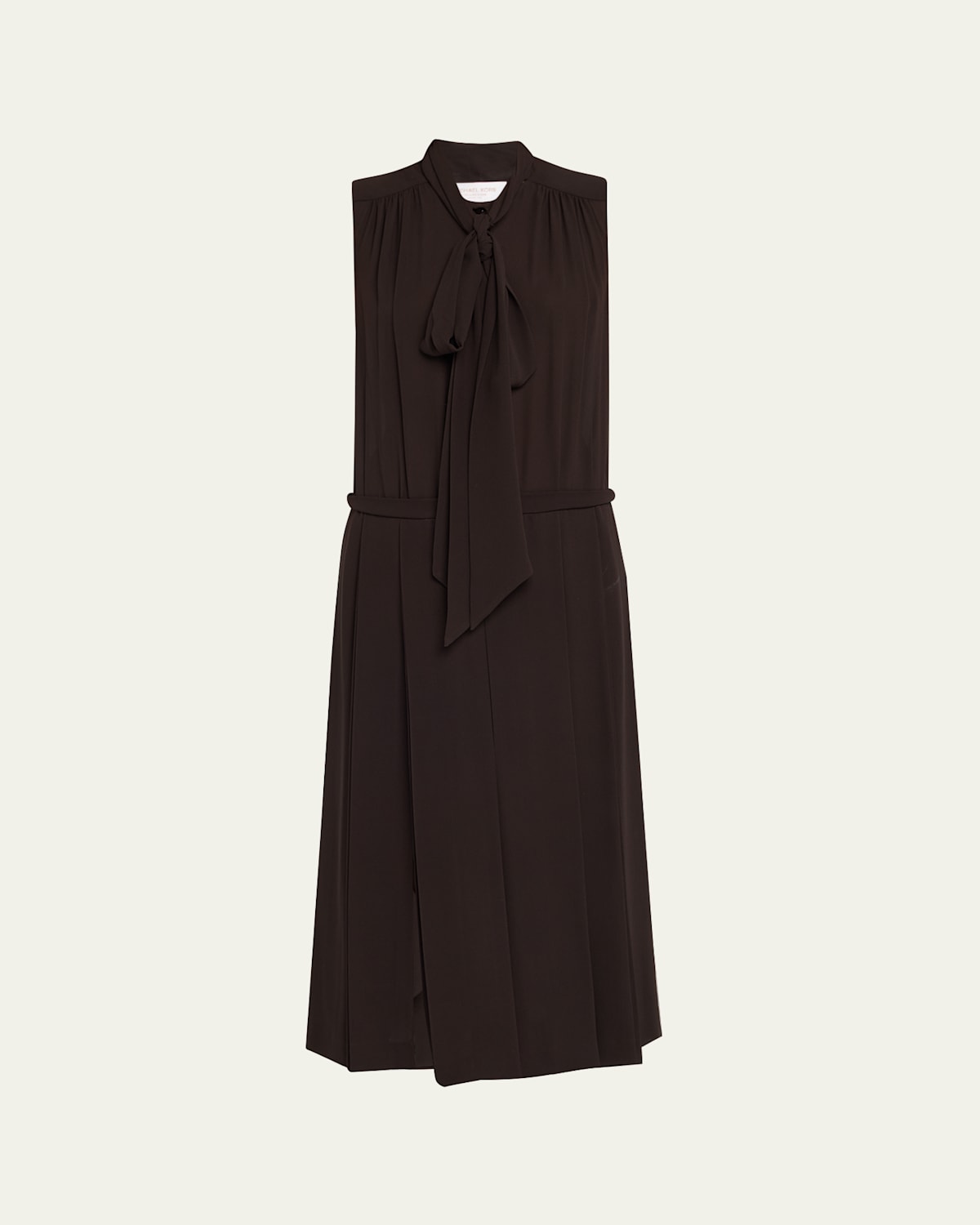 Scarf-Neck Pleated Silk Midi Shirtdress