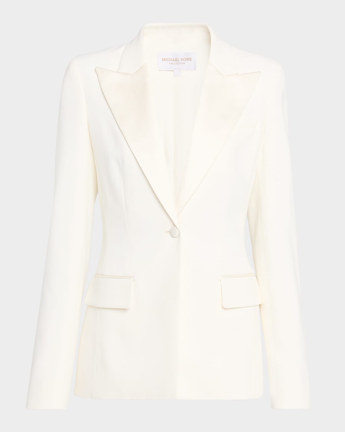 Michael Kors Collection tuxedo jacket tailored with satin lapels and trim Peak lapels; singlebreasted front Long sleeves; button cuffs Padded shoulders Chest welt pocket; side flap pockets Slim tailored fit Acetate/rayon/cellulose acetate Made in Italy