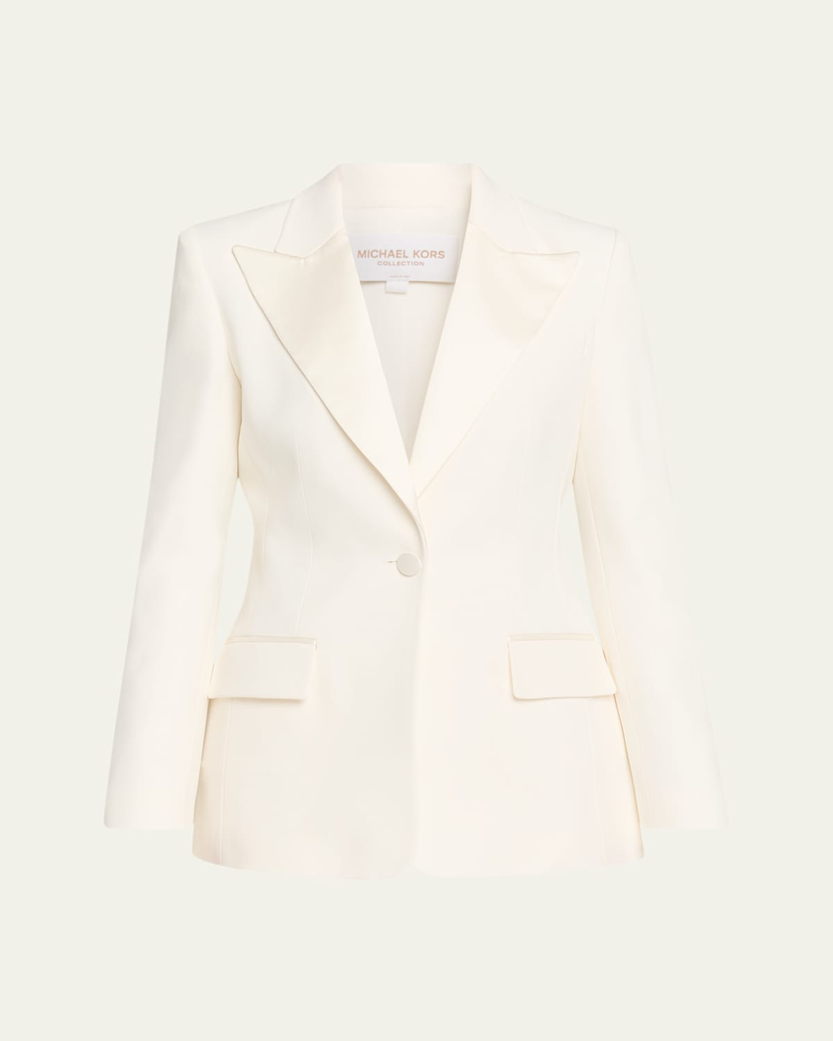 Michael Kors Collection tuxedo jacket tailored with satin lapels and trim Peak lapels; singlebreasted front Long sleeves; button cuffs Padded shoulders Chest welt pocket; side flap pockets Slim tailored fit Acetate/rayon/cellulose acetate Made in Italy